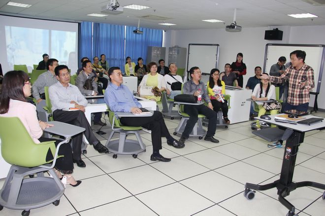 在未来教室,实验中心主任叶新东详细介绍了未来教室的教育理念、功能、建设思路以及设备配备情况,并展示了触摸一体机、双屏显示及wePresent四分屏的功用……未来教室的多屏学习空间、自由位置组合、良好的信息输入、输出、交互和呈现环境极大地引起了在坐老师的兴趣,并就相关问题进行深度交流。