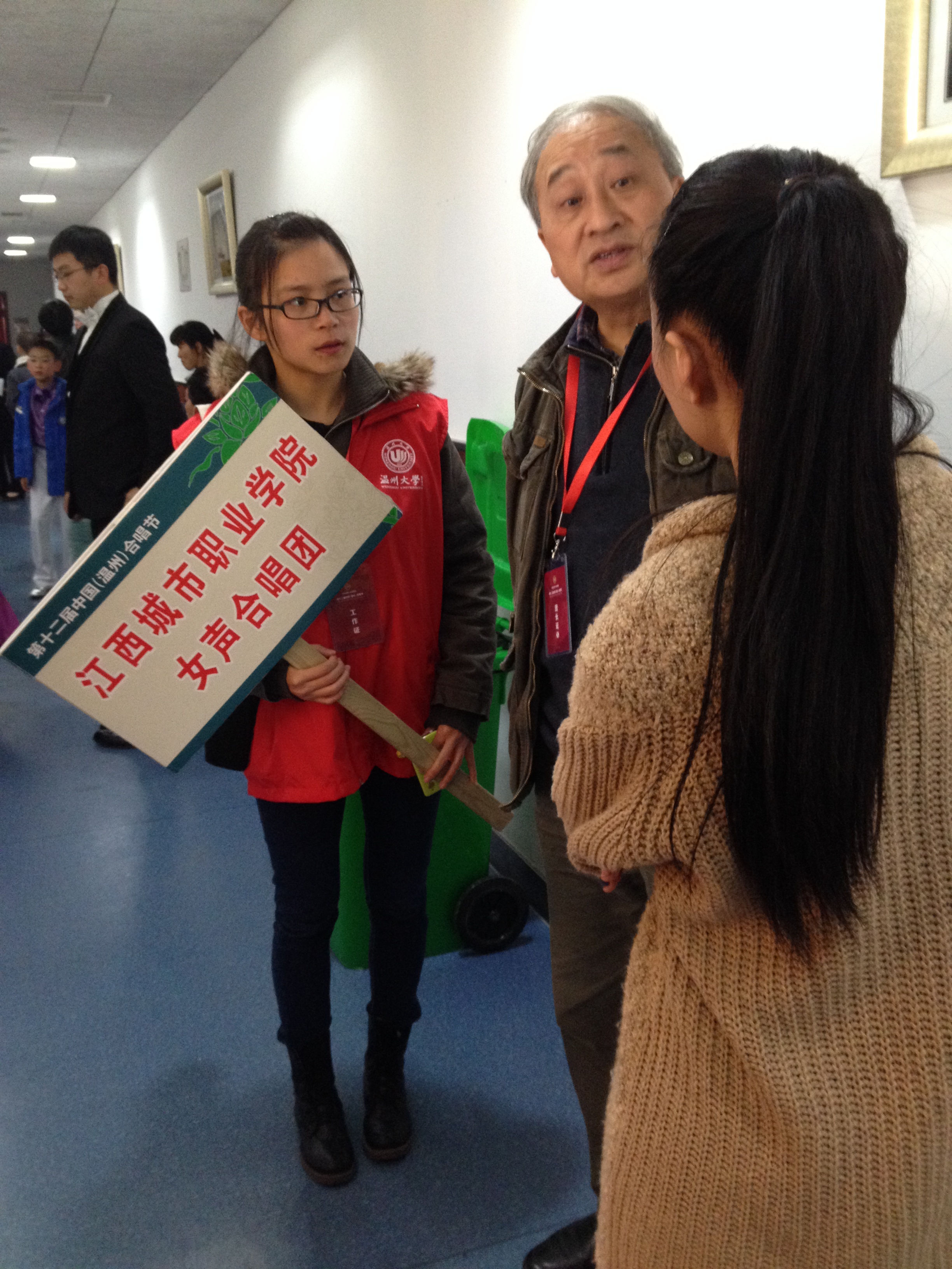 张霜琳,接待的团队是江西城市职业学院女生合唱团,该团队是自己开校车参加比赛,志愿者需要在温州西高速路口等候接团。对市区不熟悉的她在老师的悉心解说下找到西高速路口,开始接团等待之路十二月的傍晚已经颇有寒意,天色渐渐暗去,路灯早起亮起,路上的行人都裹紧衣裳,加快步伐,谁也不想落下在夜幕中。但由于该合唱团对温州人生地不熟,加之出发有些延误,整个团队真正到达时间比预期晚了将近三个小时。当小罗老师与她接头时,还没等她开口,他就急忙邀她坐上车,为她在寒风中瑟瑟等候了这么久而深感愧疚。