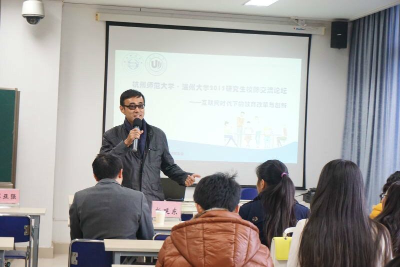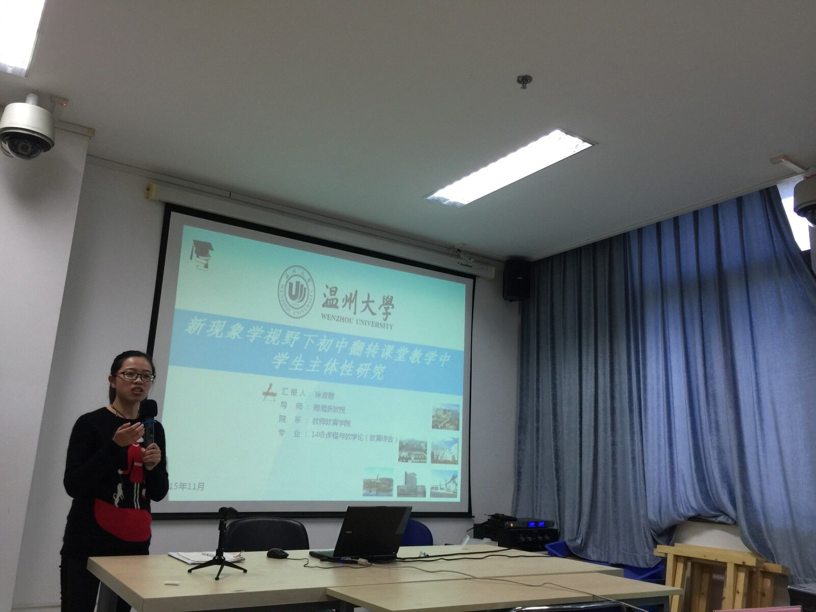 此次校际交流论坛由成人色情 研会主席王庆超与杭师大成人色情 研会主席姜霞主持。会议伊始,杭师大仲玉英院长致欢迎辞,折延东老师对温杭校际交流会的历史渊源做简单介绍并预祝此次交流圆满成功。会中,双方研究生依次交流了各自关注的学术问题,新颖独特的研究视角、丰富多样的研究内容以及汇报同学激情澎湃的论述、台下同学踊跃的提问质疑,无不吸引着与会者的眼球,会场学术氛围甚浓。师生们从研究内容、研究方法、研究视角、应用前景等方面聚集互联网时代下教育的改革与创新。会议在徐淑君同学的“新现象学视野下初中翻转课堂教学中学生主体性研究”中步入高潮,张华老师从跨学科意识、鲜明的问题意识、创造的意识三方面对此研究给与较高的评价与肯定,同学们也纷纷赞同。这让我们对互联网时代下教育的改革创新与跨学科的研究意识有了新的感悟与收获。