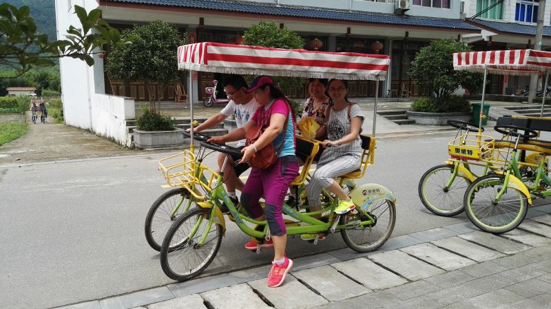 与木活字印刷展示馆依依惜别之后,教师们来到瑞安高楼塔石村的骑行绿道。或两人一辆骑行车,或四人一辆骑行车,或五人一辆骑行车,教师们兴趣盎然、意气风发地出发了。骑行在飞云江边,畅游于翠竹之间,“凉风吹得游人醉,斑驳陆离乱花眼”,身心得到无比的放松。趣味丛生的要数绿道竹林里的小江蟹,同去的小朋友们自从发现了它们,便好像哥伦布发现了新大陆。小朋友们与小江蟹的“捉迷藏”游戏给这次旅行增添了童真童趣。看到熟悉的场景,教师们也好像回到了童年。