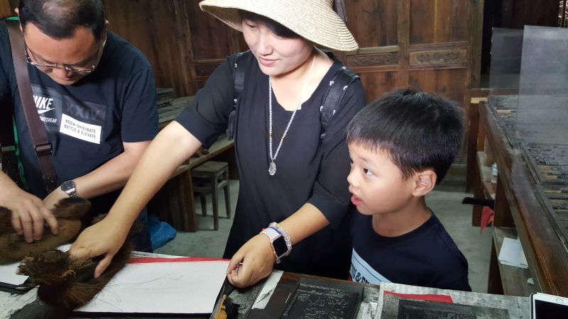 应该是满车的欢声笑语感染了太阳公公,教师们到达旅行的第一站——中国木活字印刷文化村展示馆时,天空已经展现灿烂的笑脸。该馆介绍了瑞安东源木活字印刷的历史。2008年,温州普查人员在瑞安市平阳坑镇东源村普查时发现了木活字印刷术。东源村的王超辉、林初寅等通过家族口传心授,将木活字印刷手工技艺传承至今,有800多年的历史,堪称世界木活字印刷术的活化石。该村木活字印刷完全继承了古代的传统印刷工艺,完整地再现了中国古代四大发明之一——活字印刷的作业场景。在感慨中华文明博大精深以及温州民俗底蕴深厚的同时,教师们也现场体验了木活字印刷的流程。