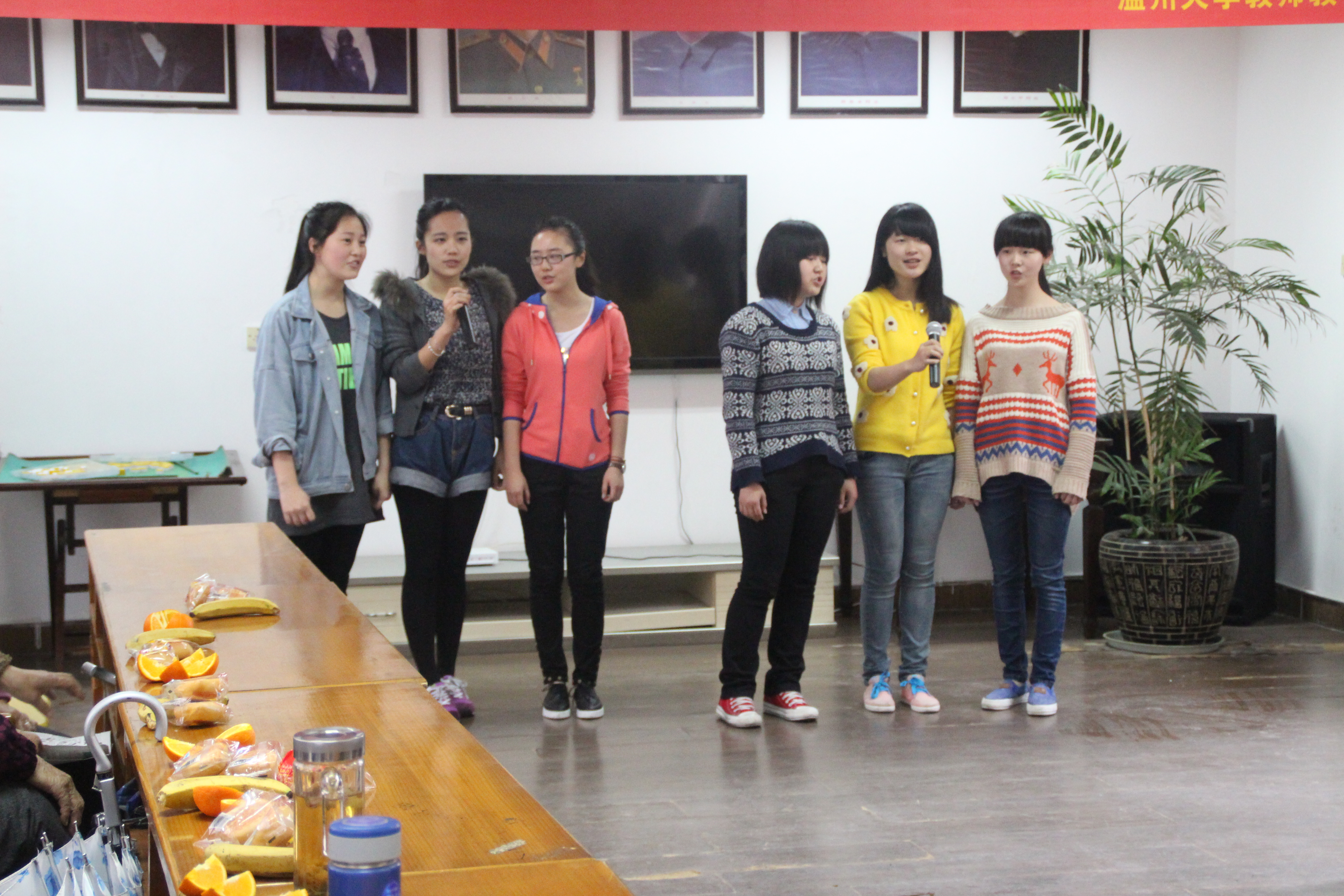 青协共15个志愿者来到了温州市信河街军分区去慰问那些老军人。活动是以落花时节又逢君这个独唱开始的,爷爷奶奶们吃着水果,嗑着瓜子认真的听着我们的合唱,独唱以及京剧节目,不时地爆发出阵阵热烈的掌声,望着爷爷奶奶脸上开心的笑容,我们心里觉得我们的付出是值得的,这些表演节目只是一个开局,后面和爷爷奶奶们一起包水饺才是本次活动的高潮部分。