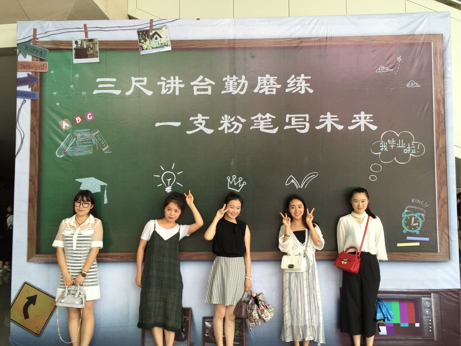 学院别出心裁地在雁山厅门口放置了巨幅的毕业生照片汇集喷绘,烘托出了“博爱雅艺”四个大字。另外一张“三尺讲台勤磨练 一只粉笔写未来”的黑板图案照片,引得同学老师们纷纷合影,定格毕业的美好瞬间。