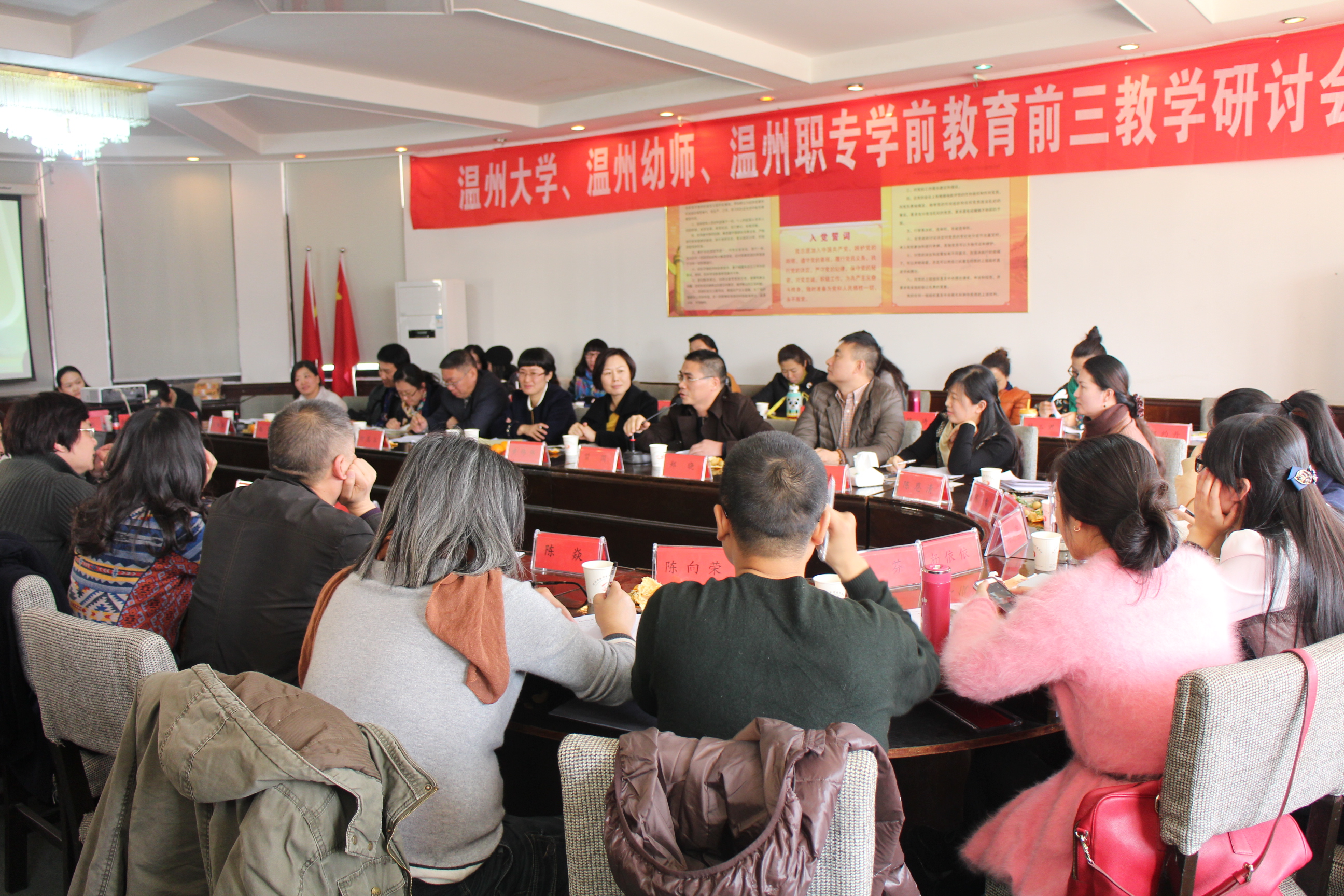 温大学前教育系主任曾国就学前教育专业全科性实践性强的特点,鼓励重视专业技能水平培养和综合文化知识水平较高的可持续发展人才。温州市职业中专幼师学部部长吕媚媚也与大家介绍职专的艺术技能分模块教学模式。最后温大孙芙蓉副院长提出三校联动要成为常态活动,不能局限于本次的教学研讨会,要从多元化手段提升学前教育前三办学经营质量。