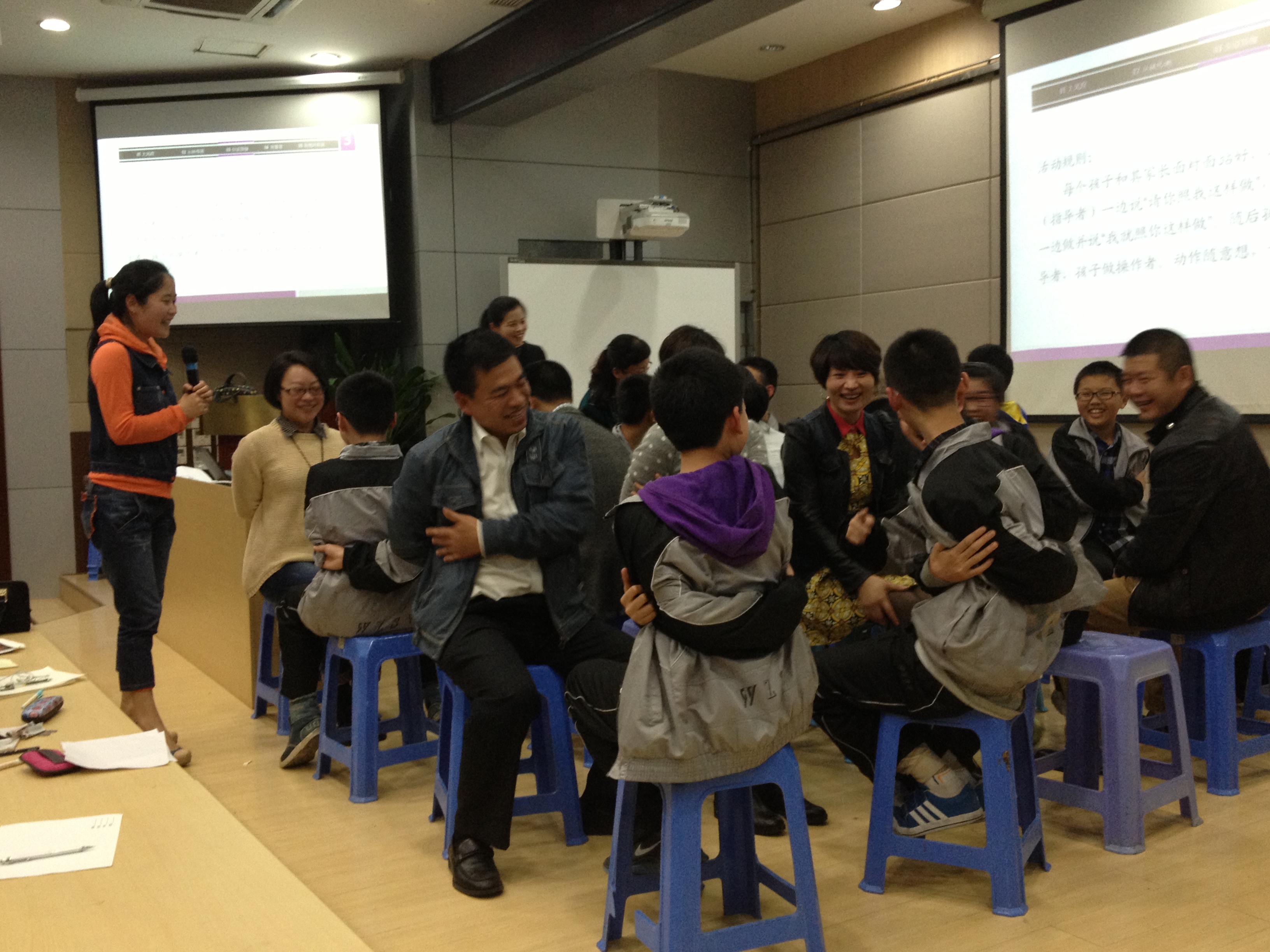 活动一开始,陈老师首先汇报了该班级学生及家长在活动开始之前所测量的“亲子沟通调查”的结果。结果显示班级的整体亲子关系良好,其中父亲与子女的关系比母亲与子女的关系好。同时指出了在亲子关系中双方在沟通上所存在的一些问题。在对现状和问题有所了解后,由心理健康测量工作坊的成员组织进行“亲子沟通团体辅导——父母是我特别的朋友”。团体辅导活动通过“丛林传画”、“你说我做”、“背靠背”等亲子沟通游戏,让学生与家长共同参与,在活动中了解彼此,在游戏中倾听彼此的真心话。最后,陈老师就“建立良好亲子关系”开展讲座。在讲座中老师立证说明亲子沟通和营造和谐家庭环境的重要性,并且分别为孩子、父亲、母亲三种家庭角色,从不同角度有针对性和建设性地提出改善和提升亲子关系的方法,指出亲子沟通不是一方的努力就能建立,需要双方的付出,互换立场的理解。