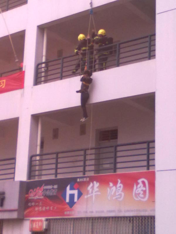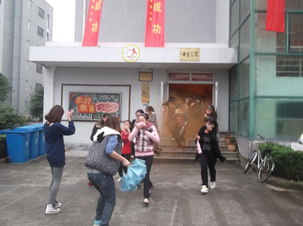 下午3:00,伴随着“消防应急疏散演习现在开始”的指令,演习正式开始。牛山消防中队专业人员在C区4号楼三楼的楼道中点燃了烟雾弹,楼道内顿时浓烟滚滚。楼内400多名学生在校园保安、公寓辅导员、学生安全员的引导下,用湿毛巾手捂口鼻匍匐穿过浓浓烟雾,沉着、安全、有序、快速地撤离到了指定的安全地带——C区中心花园。随即接到报警的消防官兵和学校保安迅速赶到现场,各种救援措施有条不紊的陆续展开。几名被困“火场”的学生经消防官兵奋力营救,通过多种救援设施全部顺利脱险。随即而来的医护人员对“受伤人员”实施了现场救护,消防队员快速使用高压水枪出水灭火,“大火”最终被消防中队官兵扑灭。
