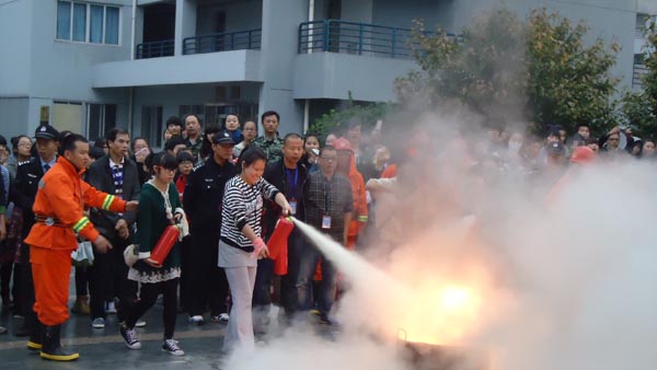 逃生演练结束后,消防官兵还在C区中心花园给大家现场演示了灭火器的操作程序,并组织参加演练人员进行了实际使用灭火器扑救火灾的操作演练。在场师生认真观摩了如何正确使用灭火器灭火,并亲自体验了现场灭火的过程,手持灭火器对3个熊熊燃烧的油盆进行了现场灭火,真正掌握了灭火器的使用方法。