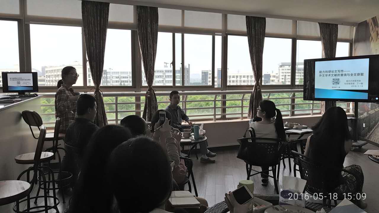 9号楼四楼十亩之间举行。本次读书会由章勤琼老师主持,丁一敏、金建钰、廖传景老师为特邀嘉宾。章老师、金老师、廖老师均以自己投稿SSCI期刊的切身经验与大家分享如何有效投稿以及投稿注意事项。图书馆丁老师则主要从如何有效检索外文期刊和文献方面给参会师生建议。