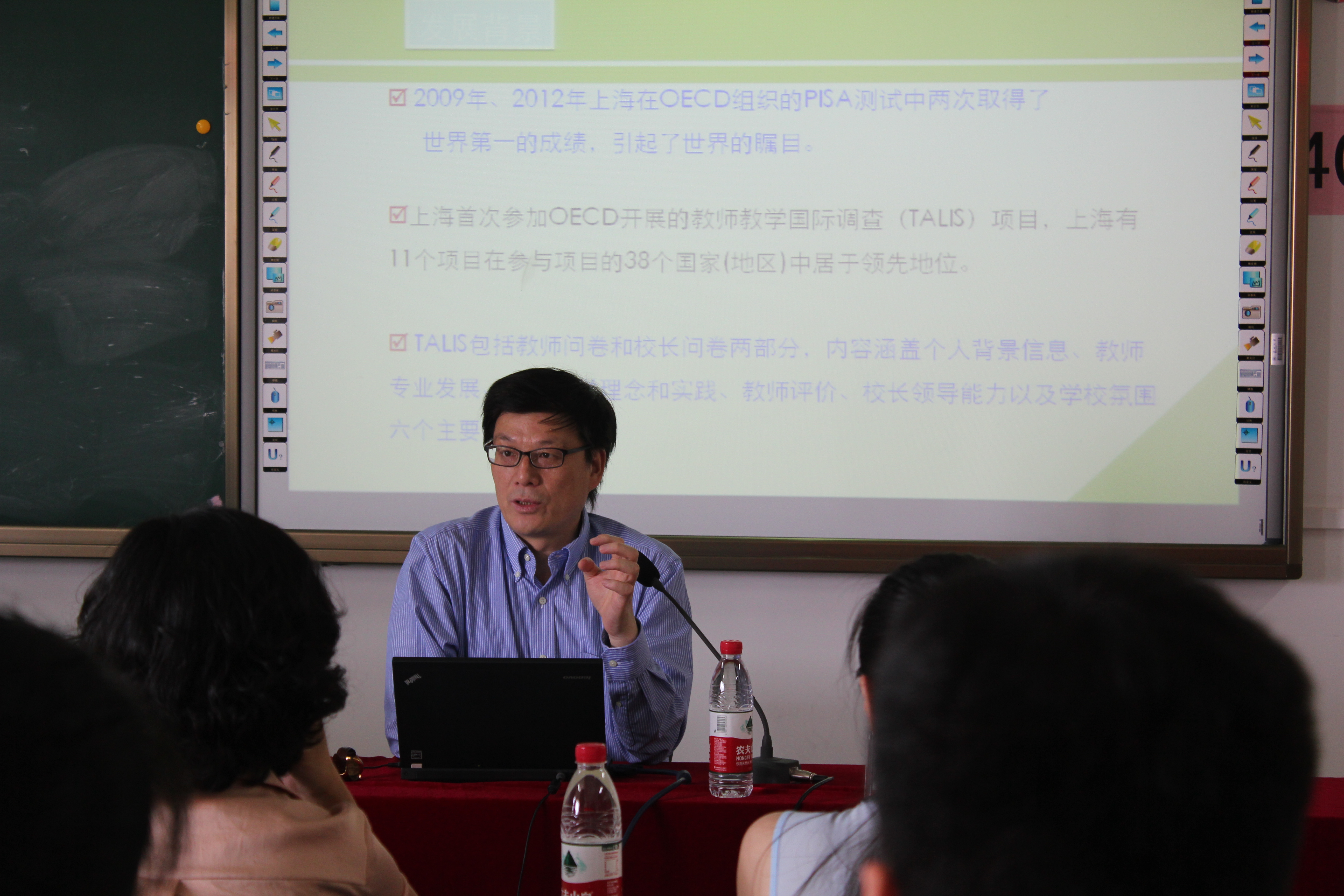 夏惠贤教授从多个方面对上海基础教育的改革和发展进行了详细分析,夏教授谈到2009年和2012年上海在OECD组织的PISA测试中取得世界第一的成绩、民工子弟与本地生源的融合教育、上海师范大学与英国学校互换教师交流项目,另外,夏教授还谈到谈到教育公平和个性化教学问题。与会人员老师和同学们对自己有疑问的地方向夏教授提问,夏教授作了耐心讲解。大家在本次讲座中收获颇丰。