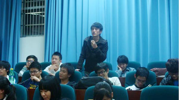 的同学肯定不会陌生。因为他的奇妙之旅,他的幸运之行,无不让我们这些同样怀揣着梦想的同学羡慕。这不,金老师以他一贯的幽默风趣之作风开始他的“耶鲁”。老师从去耶鲁之前的回忆开始,讲了他的学历,他的执教生涯。虽然老师讲的很幽默,但我们可以感受出那种卧薪尝胆的苦涩,那种怀才不遇的苦闷。我印象特深的是老师在准备去耶鲁的过程中体现出的那一份坦然,还有签证时的那一丝幸运, 就这样金老师带着行李,说着那并不流利的英语踏上了美国的飞机。在耶鲁的时光,对于金老师来说应该是个不小的挑战。时差、语言、生活习惯等等的不同都曾让金老师一度想放弃,想回国, 但最终坚持了下来,并且还结交了许多外国朋友。在那一张张合照中,我们不难看出老师在耶鲁的生活也是多姿多彩的。在老师的演讲中,不得不提他的实验。沿用老师老板的话说就是——金老师是实验室里的King, 更让我们对眼前这位幽默风趣的老师多了几分崇拜。