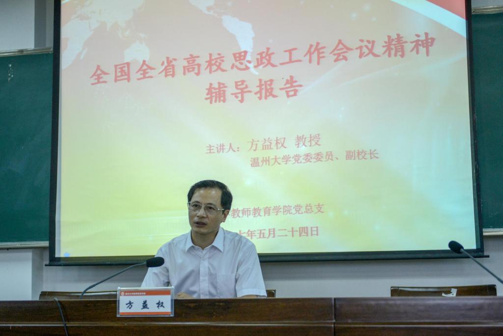 会议邀请校党委委员、副校长方益权教授为学院教师作全国全省高校思政工作会议精神辅导报告。方校长结合全国和全省高校思政工作会议精神,引导大家学习习近平总书记系列重要讲话精神,特别是习近平总书记关于加强意识形态工作,加强高校思想政治工作等方面的重要讲话,指出,作为高校要紧紧围绕立德树人根本任务,切实承担起人才培养的重大责任。他从深刻认识高校思想政治工作的重要性,全面加强高校思政工作,提升立德树人的实效等三个方面进行了系统的阐述。他指出,全面加强高校思政工作要着力做好三项工作。一是要着力抓好师生为主体的理论武装工作;二是要着力抓好课堂教育的主渠道作用;三是要着力管好主阵地。要着力管好主阵地,占领网络阵地,建设红色网络,把握讲座论坛的关口,把好学生活动关、人才引进关、出国出境关、研究生招录关等多道关卡;要着力提升文化育人,加强文化软实力和学院凝聚力的建设。要善于抓住关键,着力提升立德树人的实效。为此,他对广大教师提出要求。要在提振精气神上狠下功夫;要在守好一段渠上狠下功夫;要在改革创新上狠下功夫。