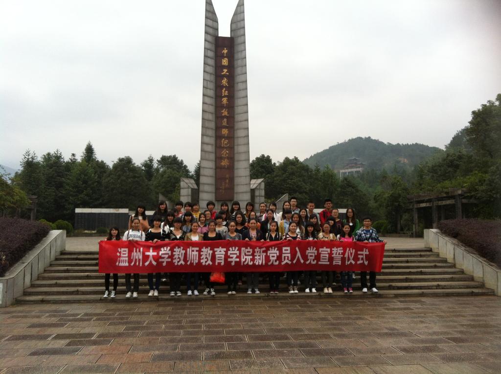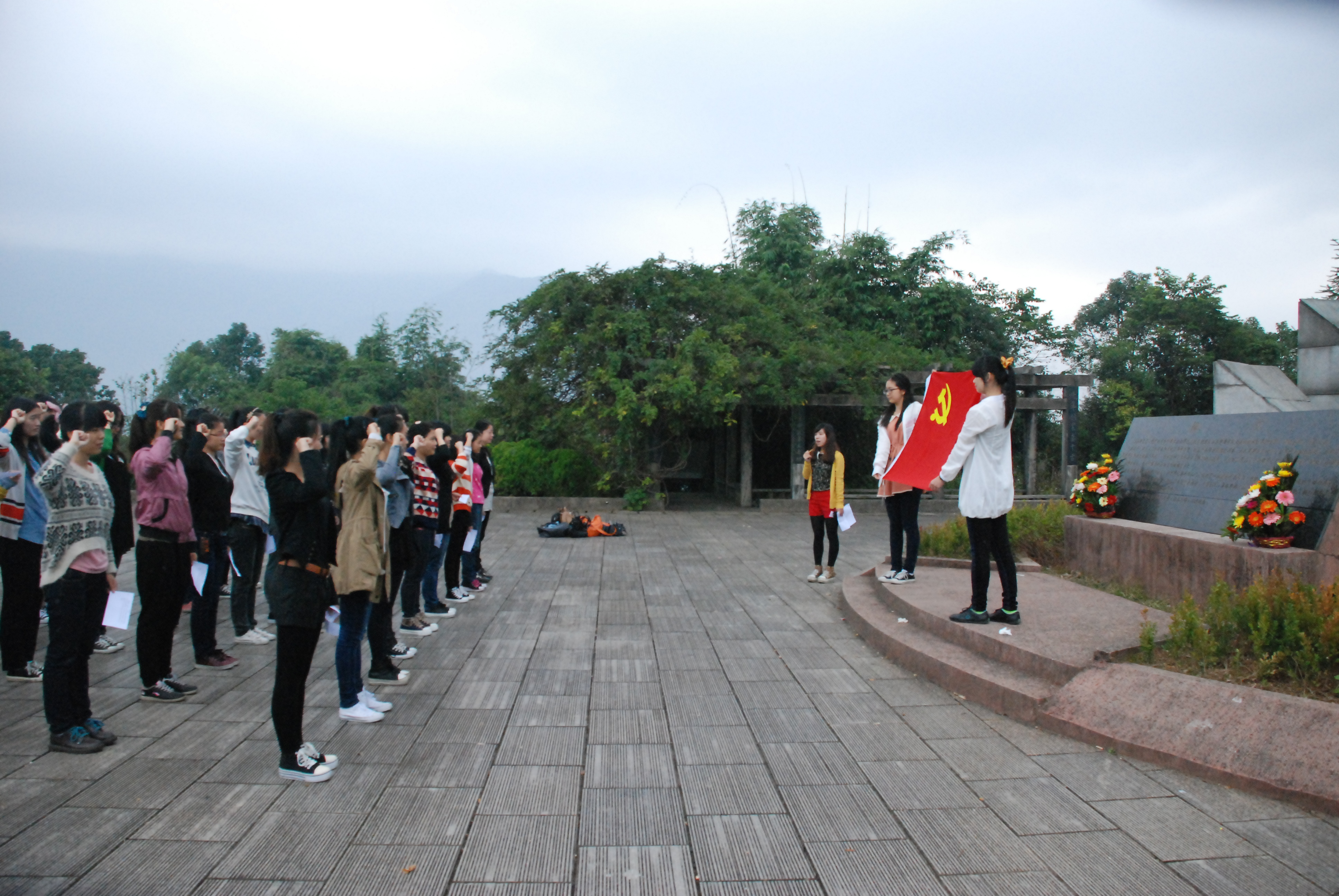 11月3日上午9点,我们一行人冒雨到达平阳县的中国工农红军挺进师纪念碑。在雄伟的纪念碑下,我们庄严地向烈士敬献鲜花,全体师生党员集体默哀1分钟以表达对烈士的哀思。接着,新党员在纪念碑下进行了入党宣誓仪式,老党员重温了入党誓词。尽管天不作美,下着雨,但学生党员们巍然不动,庄重严肃宣誓,表达出同学们对党的热爱之情接着,全体党员学习了纪念碑碑文,同学们在了解革命战争时期先辈艰苦卓绝的奋斗历程中接受洗礼,实现精神升华