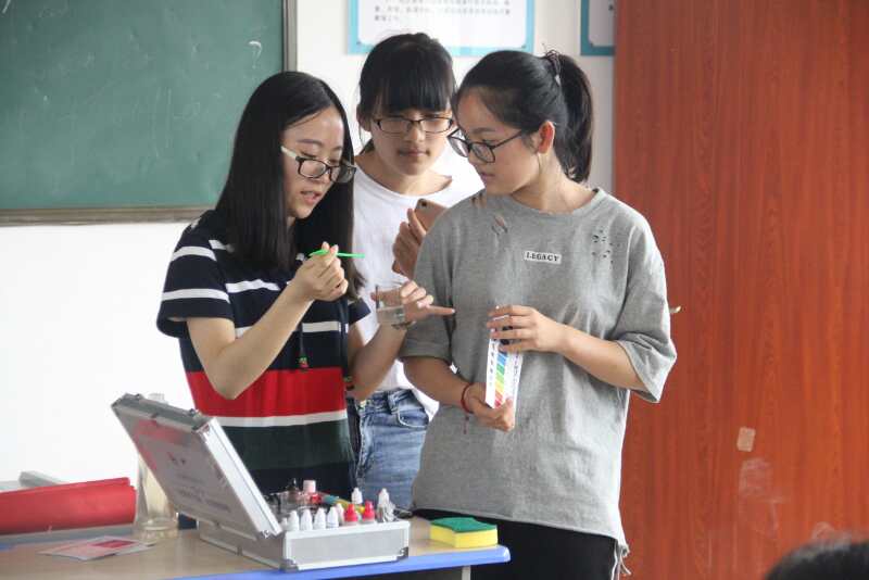 匆匆午饭过后,志愿者们乘着校车来到了目的地--乐清市南岳中学。在短暂的稍作准备后,当地南岳中学的学生,排着整齐的队伍,来到了教室,并安静地在教室中坐下。只见志愿者从容走上讲台,为同学们介绍劣V类水类型,她将曾今发生在身边的余姚水灾的事例融入到讲课中,使同学深刻感受到如今的极度被破坏的水环境对人们的生产生活,甚至一个国家的发展趋势都产生了不可挽回的危害。其次,她提出了治水剿水的重要性,以及以一个学生角度出发,提出能为国家政策出力的建议。为了能使同学们更具体的了解这个项目,志愿者们在课堂上为同学们展示了利用PH试剂对水样酸碱性的检测以及对水质色度的检测,同学们都惊叹于水的颜色在试剂的作用下,从无色变成了蓝色或者是粉色。一堂课下来,各个都受益匪浅。