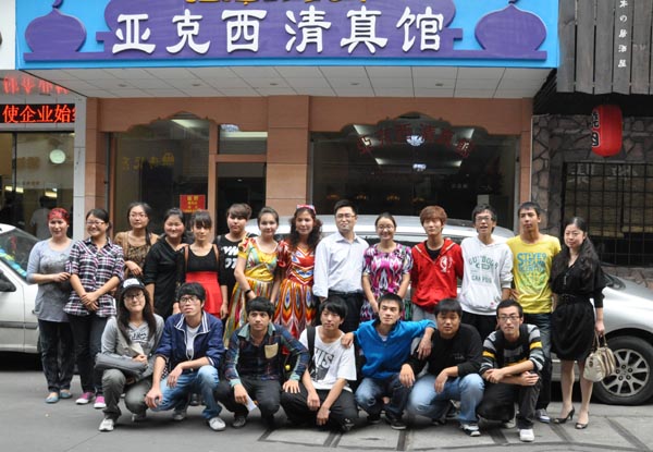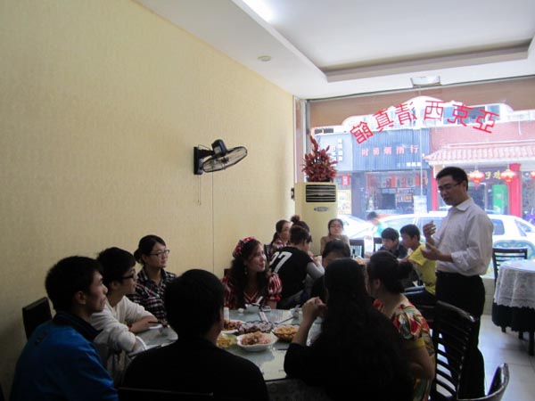 11应心班的团支书罗余军同学为大家高歌一曲,人文学院的两名新疆同学献上了动感、青春的热舞。在小小的餐馆里,一起来庆祝节日的穆斯林,也被我们欢乐的气氛所感染,为同学们的精彩表演热烈鼓掌。
