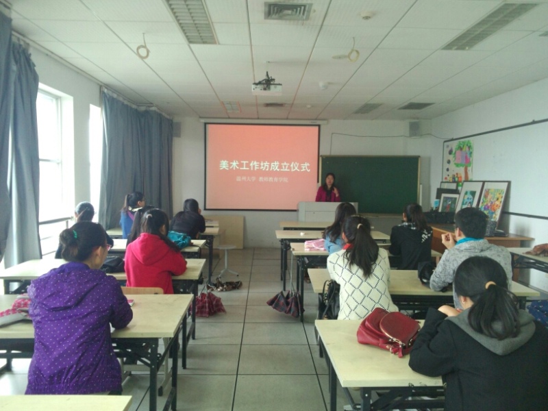 学生的文化艺术素质和专业技能,增强学院服务地方的能力。是进一步提升师范技能,发挥专业优势与辐射作用的一项重要举措。希望在座的每一位成员一要珍惜学习机会,在提高自身技能的同时,多参加各类竞赛,服务于学校大型展览活动等;二是能从“工作坊”这样的载体中获益,并能带动其他同学共同进步,从而为学院学风建设服务。