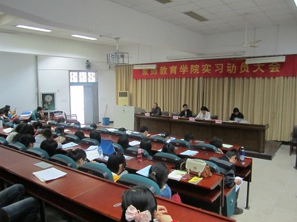 10月31日下午1:00,在学院教务科的组织下,09教技、09心理、09学前实习动员大会在北校3号楼101大教室胜利召开了。出席本次会议的有学院分管副院长彭小明教授、各系主任和书记、各系带队指导教师,以及09教技、09心理、09学前专业126名同学。本次动员大会由教务科胡孙贵老师主持。