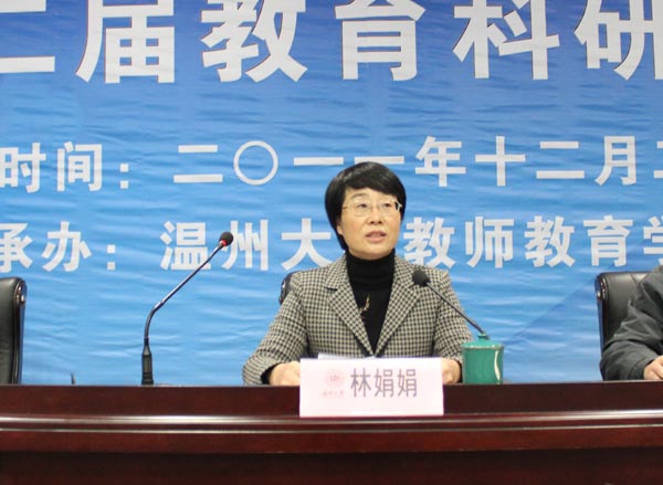 林娟娟教授为获奖学院及论文作者颁奖并发表重要讲话。她代表学校对本次年会顺利举办表示祝贺,她充分肯定了年会论文的质量,认为与会论文展现了我校教育科研的实力和水平,体现了我校教师教育的优势和特色。她强调要结合校“十二五”发展规划,利用学校教育科学研究学术年会平台,进一步认识教育研究的重要性,为打造研究型大学而努力。