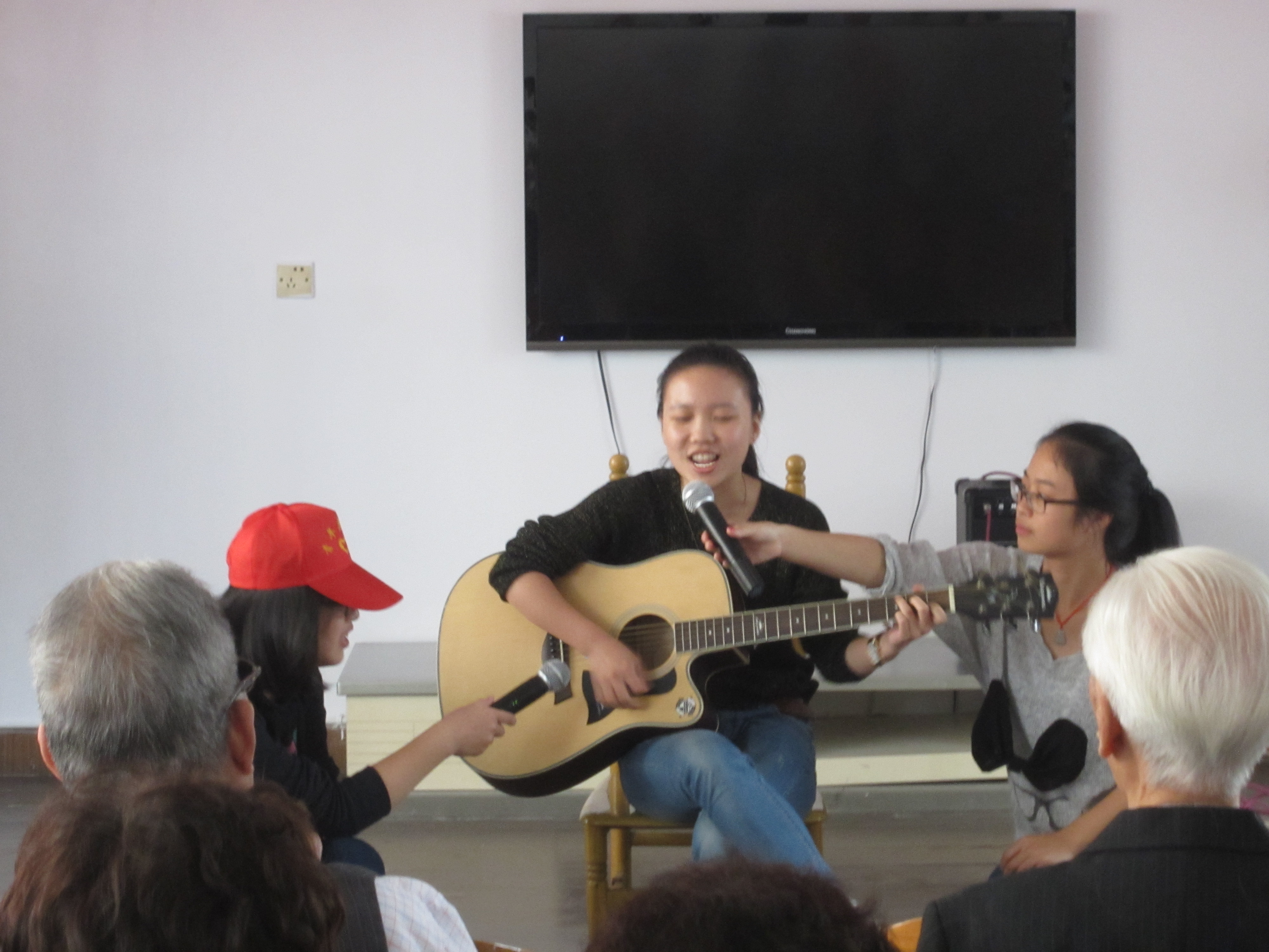 四位女生带来的富有爱国色彩的合唱《爱我中华》,四位女生载歌载舞、活力四射的演出一改这类歌曲演唱是单一呆板的形式,节目一开始,就博得老人家们的喝彩。一曲过后,小品《开门》闪亮登场,台上三位女生用生动幽默的语言,富有表达力的形体动作,精彩绝妙的反串完美的展示了这个小品,虽然这中间出现的一个忘词的小插曲,但是在小品结束后,还是赢得了爷爷奶奶们热烈的掌声。之后,一曲激昂有力量的《精忠报国》充分体现的机电工程学院的特色,在清一色的女生表演之后,确实让人眼前一亮。第四个节目,是由谢翔同学带来的文情并茂的诗歌朗诵《赞老人》,充分表达了当代学子对来人的关爱与敬爱。接着,一曲吉他弹唱《童年》,展示了成人色情