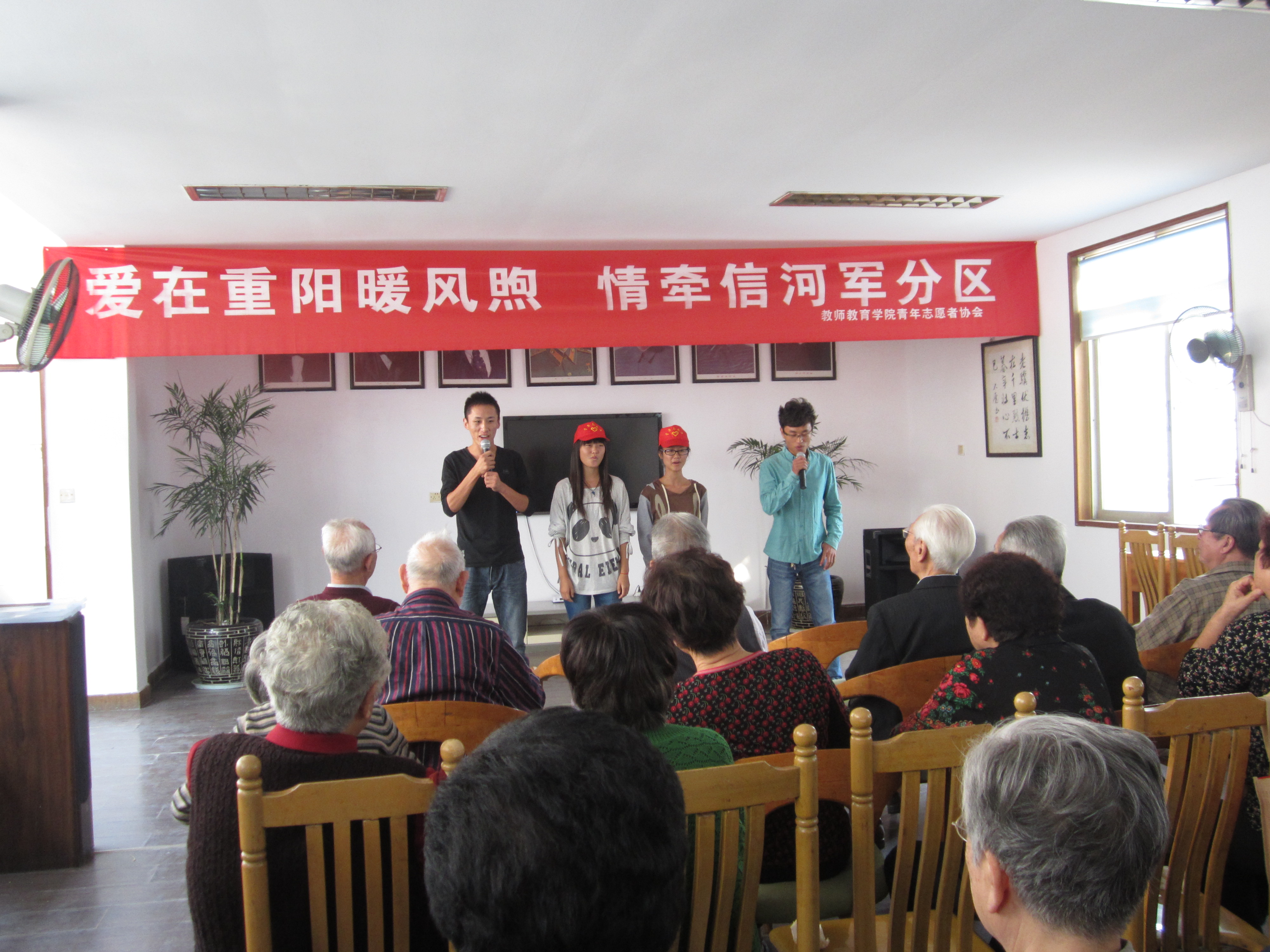 主办、机电工程学院协办的重阳敬老志愿活动,在位于信河街的军分区展开。下午2点,志愿者们在军分区内忙碌地布置着场地,以期呈现一个完美的演出场地。50分钟之后,场地布置告一段落,重阳节慰问演出正式开始。首先是由军分区负责人杨叔叔带来的一段讲话,表示了对远道而来的学子们的感谢以及对接下来精彩节目的期待。紧接着,来自教师成人色情