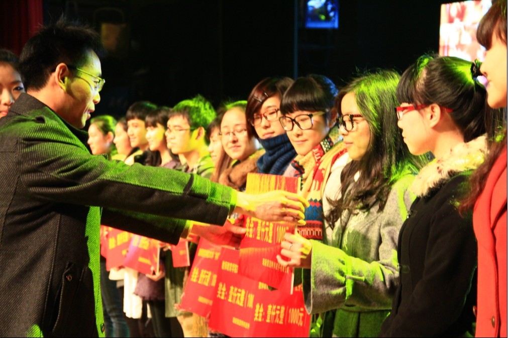 元旦微博墙不断留言、刷屏,期望高频率的留言可以增加获奖的几率。另外,同学们的新年祝愿卡片也充满了抽奖箱。晚会现场通过抽取新年祝愿卡,抽取了五十位观众荣获三等奖,三十位观众荣获二等奖,五位观众荣获一等奖。礼品虽小,但是代表了学院对于同学们浓浓的关爱,也是成人色情