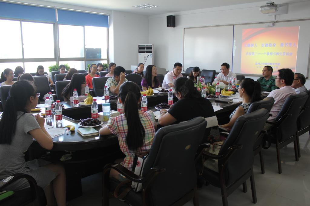 上午10点,在茶山南校区9号楼A410会议室,学院领导、教师代表及学生代表等30余人齐聚一堂,参加学院庆祝第三十一个教师节师生茶话会。会议由杨立淮书记主持。首先,杨书记带领大家一起学习了习近平总书记给“国培计划(2014)”北京师范大学贵州研修班参训教师的回信,并特别指出广大教师“要努力做教育改革的奋进者、教育扶贫的先行者、学生成长的引导者”。
