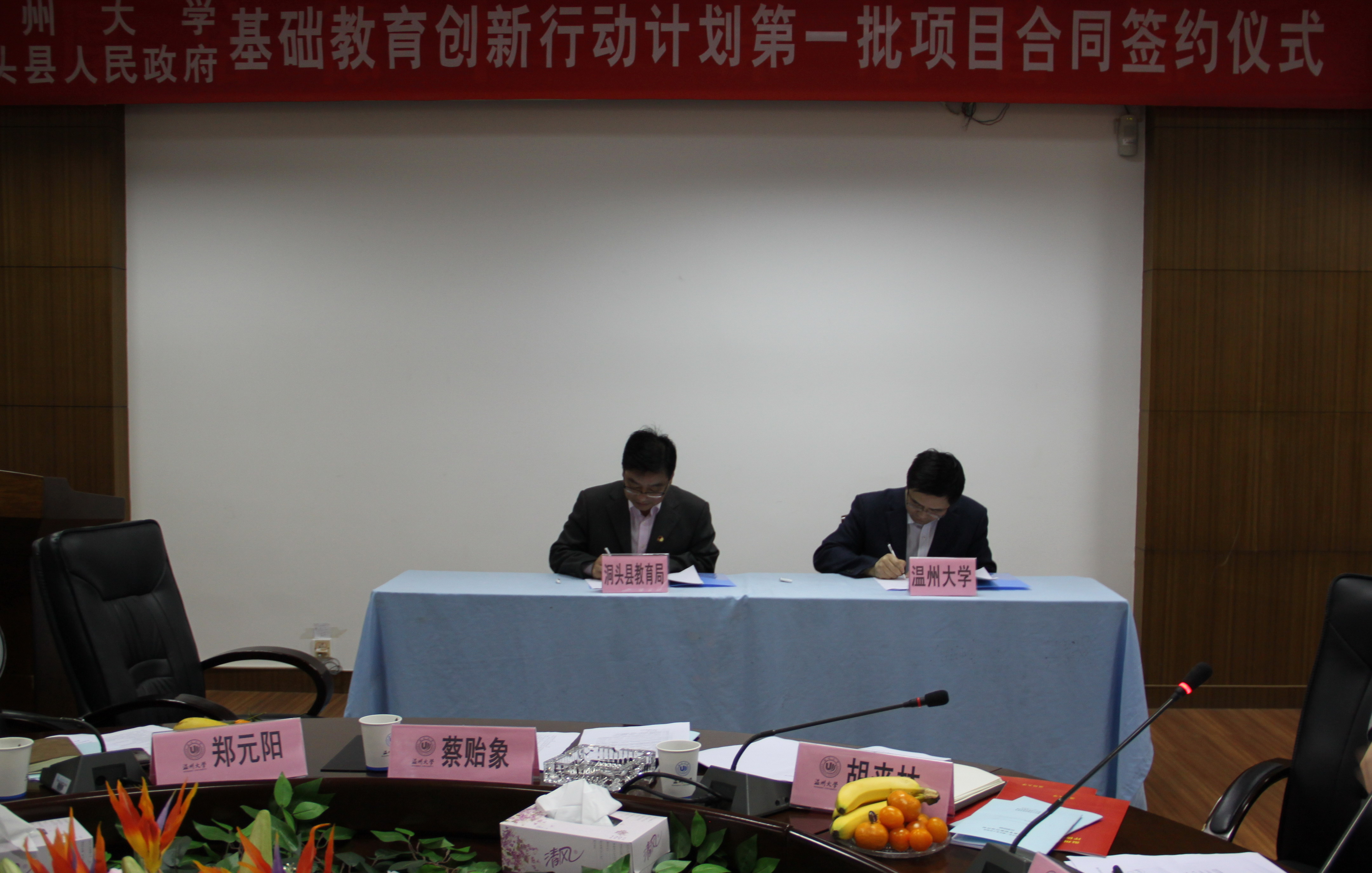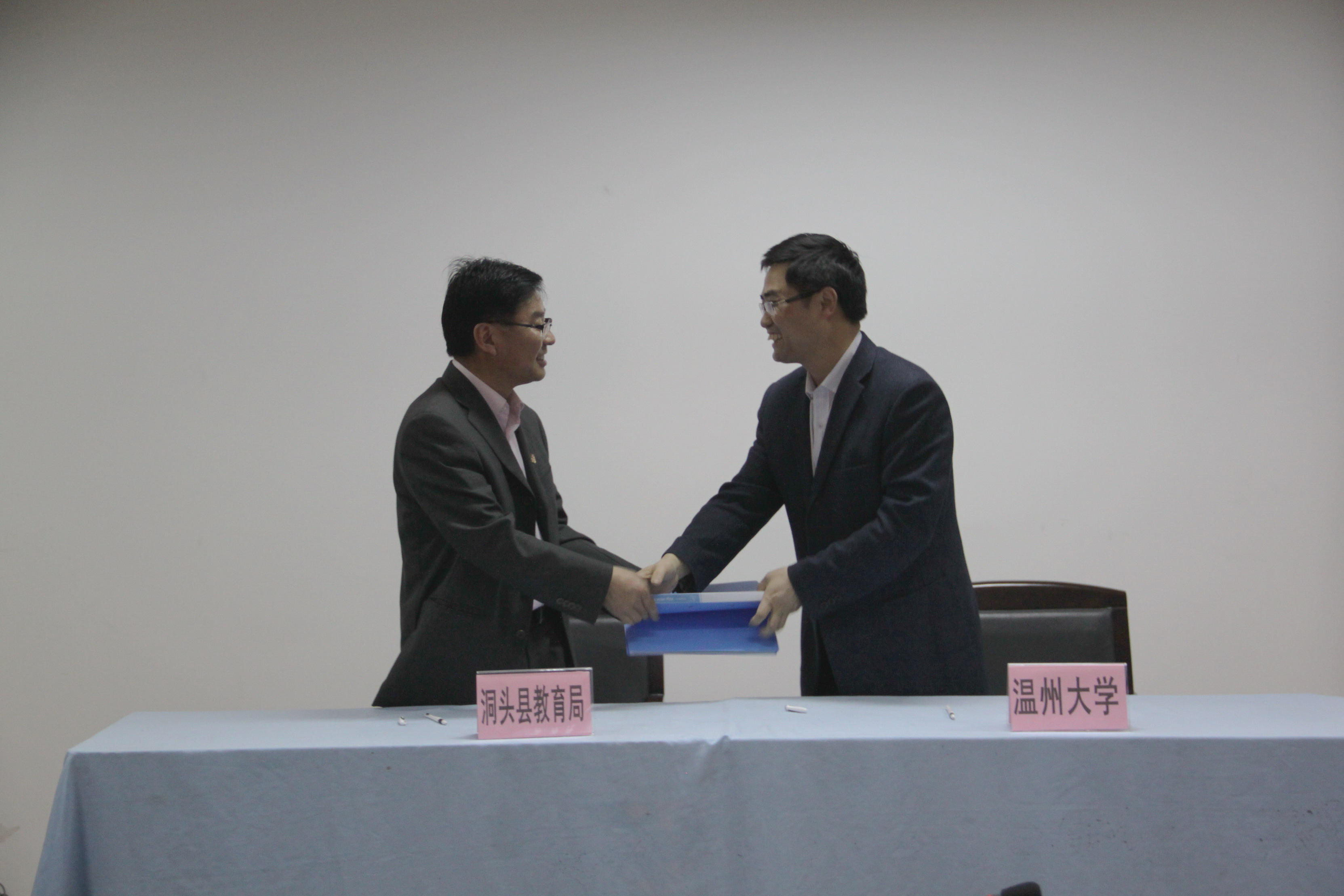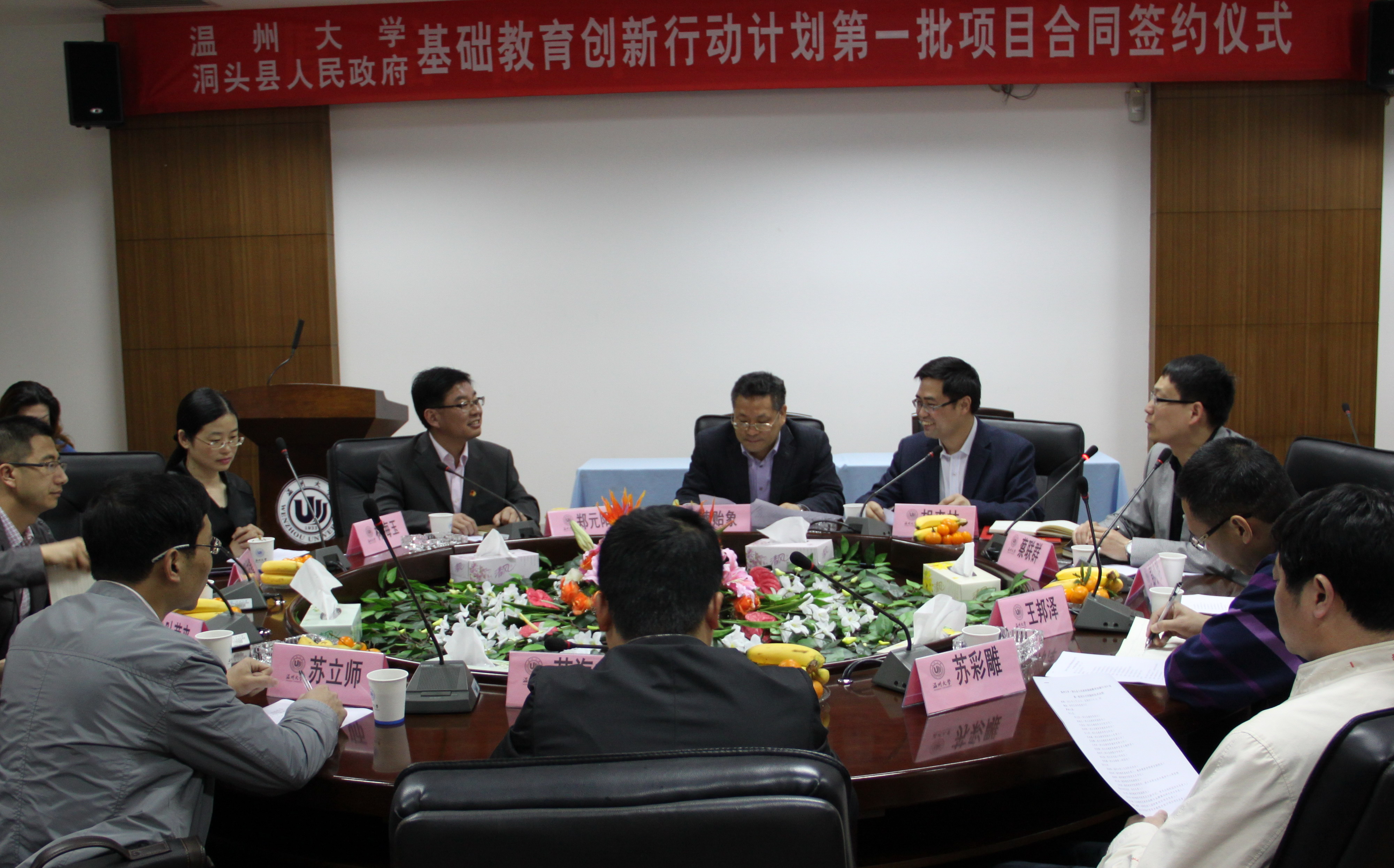·洞头县人民政府基础教育创新行动计划第一批项目合同书上签了字。本次签订的合同中包括16个具体项目,总经费达75.5万元,项目期限一年半。合作内容涉及特色学校培育、课程与教学改革、教育信息化提升、教育科研水平提升、学生综合素质培养等五大领域。在第一批项目结题后,双方还将继续开展第二批、第三批项目的合作,以实现我校与洞头县人民政府签订的五年合作协议的承诺。同时,这一合作模式将来还可复制到其他县市区。
