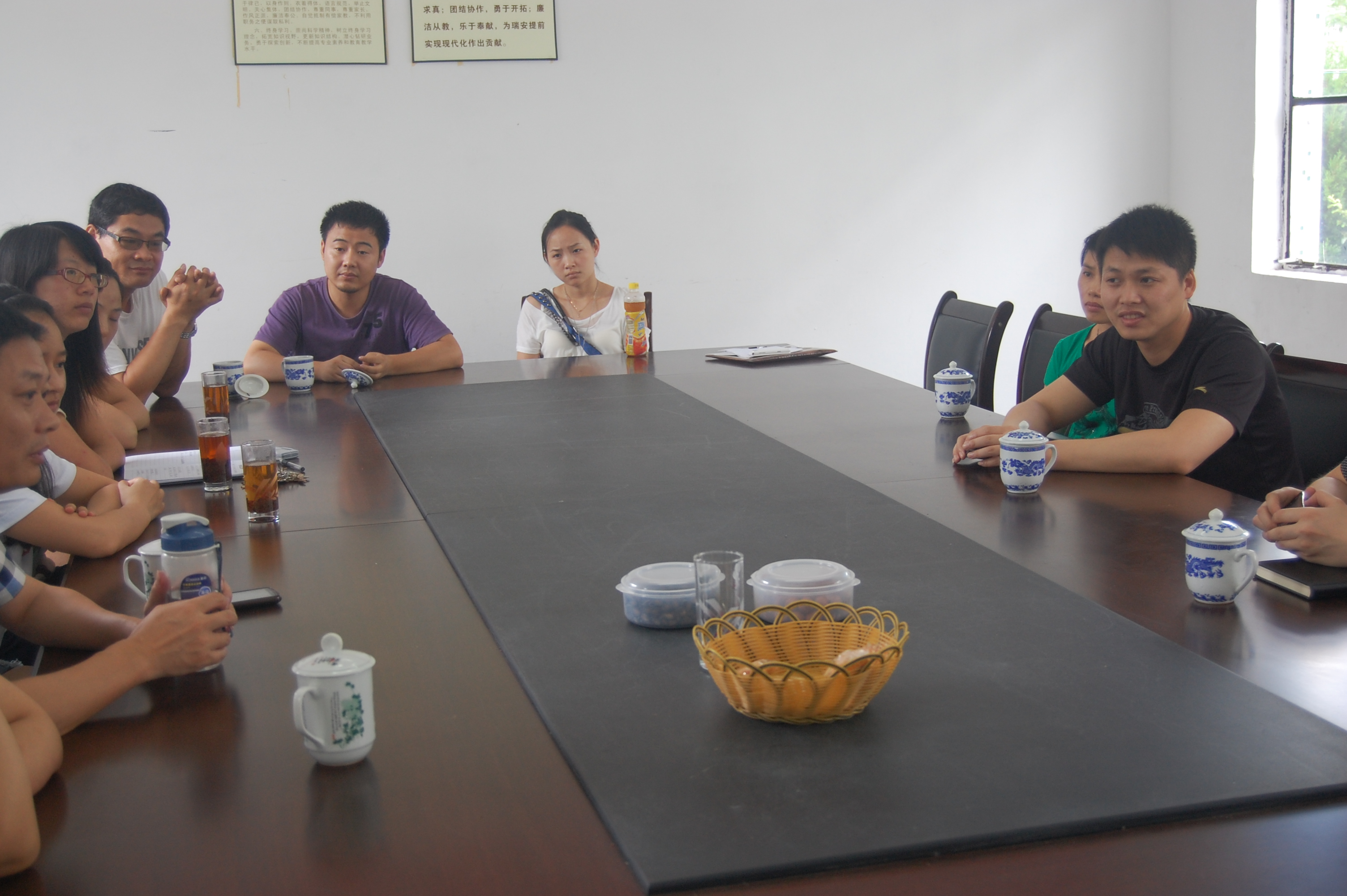 小教系主任蔡志凌、实践队指导老师胡瑞美、枫岭乡学校校长戴晓佳和学校里的其他老师以及实践队队长郑洁同学带领个别队员同他们进行了交流。本次交流除了关心实践队的活动开展和队员们的生活情况之外,主要争对世界人口日的临近做了关于计划生育宣传活动的事宜安排和意见交流。下午13:00,蔡志凌主任与指导老师胡瑞美老师同时间队员们进行活动交流,再次交流活动心得并对活动中遇到的困难和不足进行沟通解决,会议中也提出了队员们的生活和活动注意事项,再次强调了队员们之间相互合作、相互促进的重要。