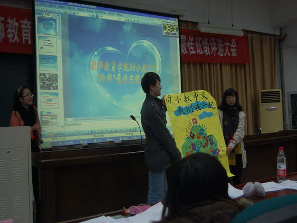 优秀学生评选结束后,紧接着是最佳班级的评选活动,同样分班级展示、答辩、投票三个环节。08小教本一、09小教中文、09小教数学、09学前本、11学前大专二班及09学前中专一班共6个班级入围了此次评选活动。在班级展示环节,11学前大专二班带来了别开生面的表演,向大家展示了本班的风采;来自09小教中文班的同学们也个个有备而来,通过书法、美术作品等展现了本班同学多才多艺的一面;提到“向幼转”,自然而然地想到了09学前本的一群可爱的同学们,她们高涨的热情就足以体现她们班级强大的凝聚力。开头的那一幕便是09学前本在班级展示前喊出的口号。