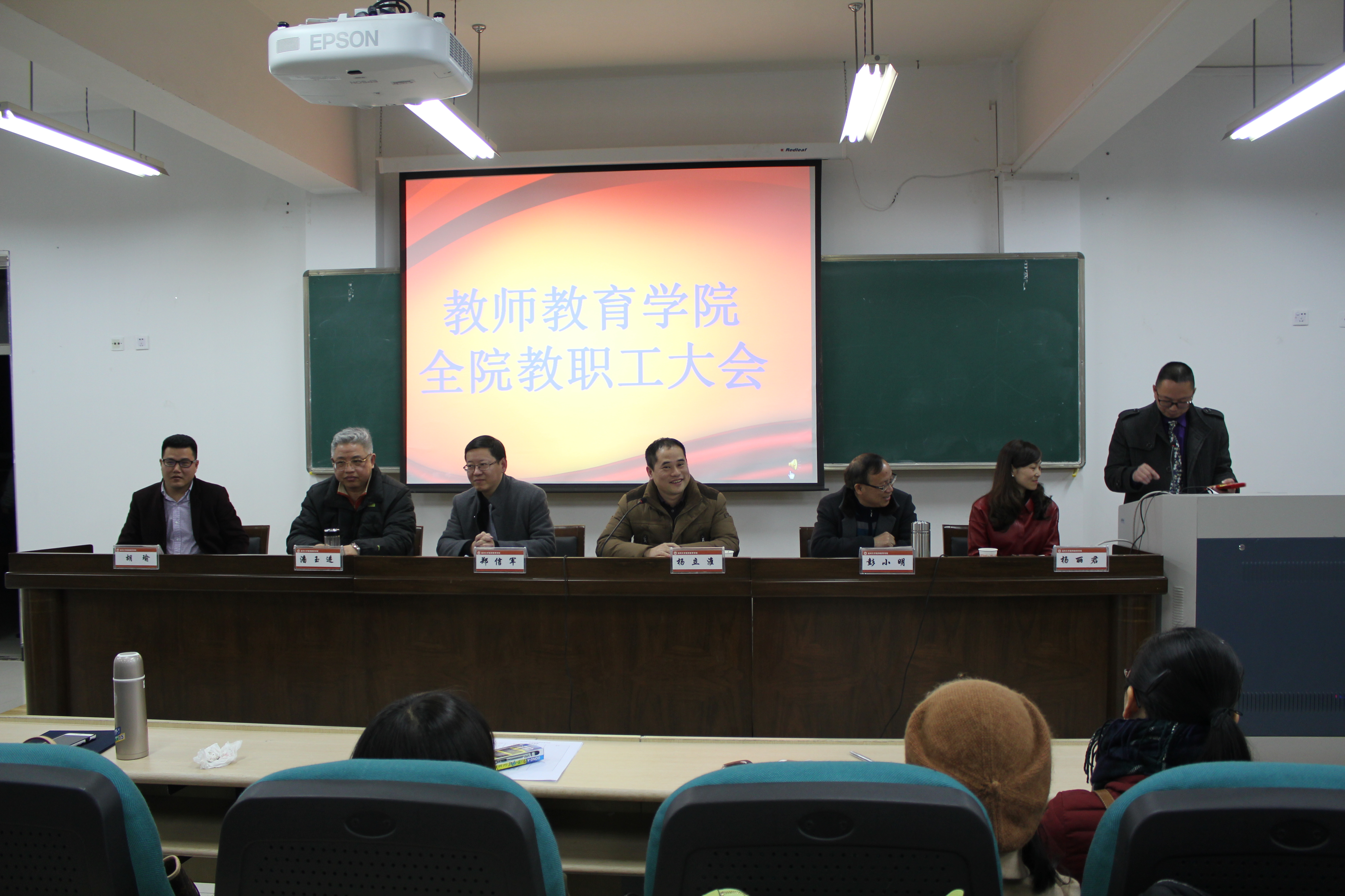 郑信军院长在会上作《学院十二五工作报告》。他总结了学院十二五发展取得的主要成绩。在十二五期间,学院凝练了“博爱雅艺”师范气质,充分体现了学院精神与人才培养理念;顺利完成搬迁工作,改善了办学条件,通过国际合作以及地方服务拓展了办学资源;通过开展“惠生工程”、“全员承诺”、“一部一品”、“做成一件事”等系列活动,加强了以“责任”和“投入”为核心的师资队伍建设;顺利通过校重点A类学科建设项目验收,成功获得教育硕士学位点授权,奠定了教育学科稳步发展的基础;强化了教学过程管理与目标管理,教学业绩考核连续四年优秀,形成了各有特色稳定发展的专业格局;完善了育人自育的体系与机制,构建了以培养“博爱雅艺”师范人才为目标的学风建设体系,塑造了以立德树人为根本任务的学院文化育人品牌,学院党总支连续三次优秀,并获得省高校基层党建工作示范点荣誉,提高了教师教育人才培养质量;通过教师继续教育、基础教育创新行动计划、面向基础教育课题、出版《现代教育》内刊以及儿童剧公演等多方面工作,提高了服务地方基础教育的质量和水平。当然,在十二五期间也存在很多问题和不足,学院师资队伍亟待加强,专业结构不良,人才培养前瞻性有待加强;专业建设水平与人才培养质量亟待进一步提高;学科建设缺乏明确的团队、方向和特色;地方服务缺乏系统规划与有效拓展。十三五期间,学院仍然处于由教学型学院向应用型学院过渡的发展状态,依然处于艰难的爬坡期,是为“十四·五”发展积蓄最大动能的时期,也是学院独立培育办学特色的重要时期。郑院长向各位老师介绍了学院十三五发展指导思想与目标,并说明了十三五发展量化指标。最后,他提出了希望,希望全体师生同心同德、团结协作,坚持育人为先、树人立德,加强师资队伍建设,扎扎实实地以有内涵、接地气、有质量的特色重点项目建设为引领,注重内涵、打造特色,学院才能取得真正意义的发展。