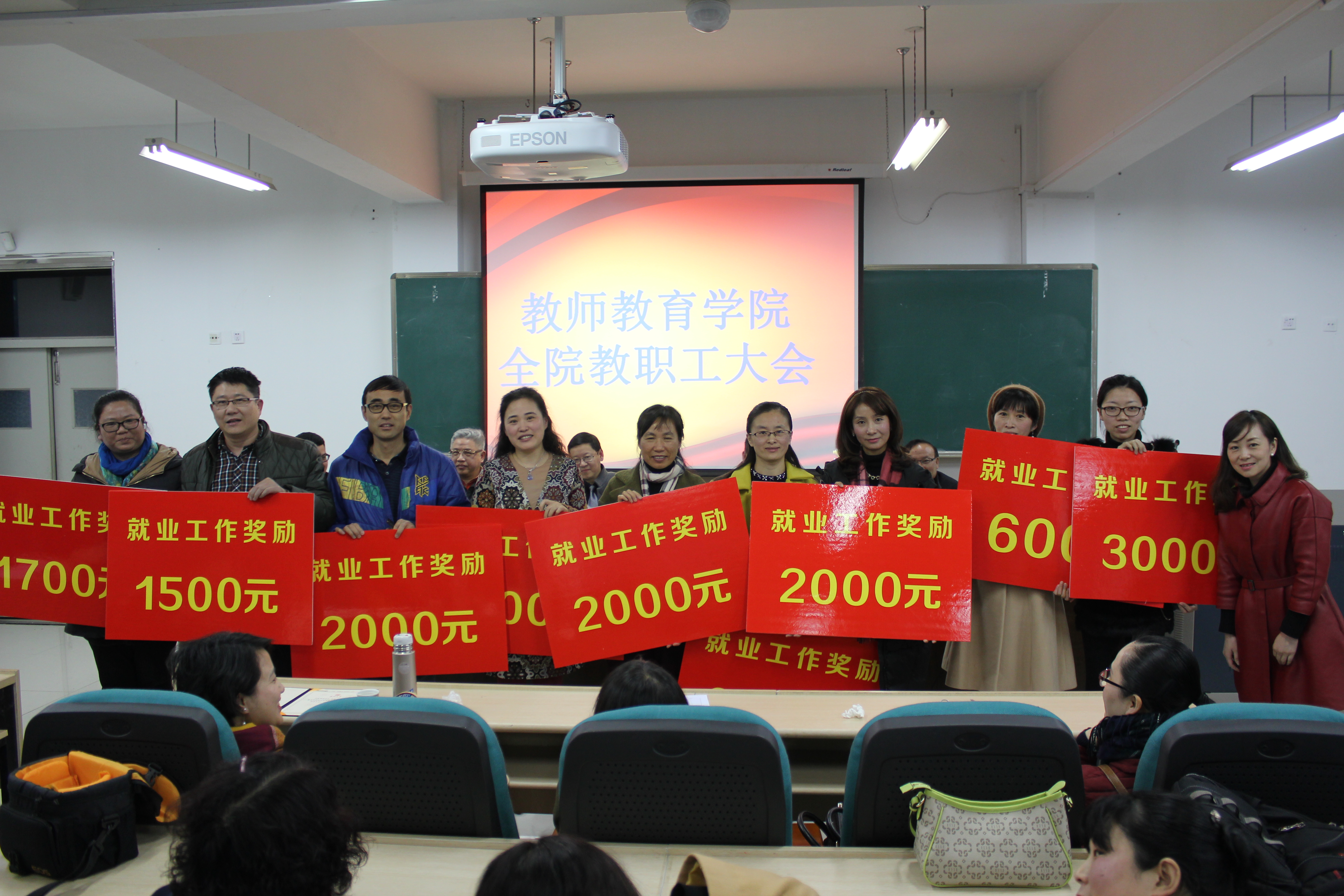 会议表彰了2015年院长特别奖获得者、2015年就业工作先进个人(集体)和2015年院工会活动积极分子。胡瑜、颜文靖、罗顺文、陈正枫等4位老师以及行政管理团队、小教专业学生竞赛指导团队等2个团队荣获了2015年院长特别奖。折延东、盛建森、李伟、张龙、徐平、陈铿、朱春桃、章伟丹等八位老师及学生科获得了就业奖励。朱伟、金荣乾、折延东、谭莉、严晓秋、胡铸鑫、邵胜男等7位老师获得了工会活动积极分子的奖励。