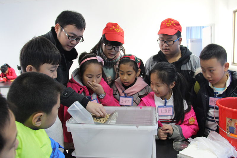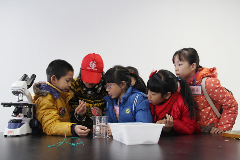 自然科学实验室里,在金建钰老师的指导下,志愿开放活动的小老师们给孩子们讲解了显微镜的结构及操作步骤,结合实物协助他们制作紫鸭趾草临时装片,指导孩子们观察蛔虫、草履虫临时装片。此外,实验室饲养的一些小动物给本次开放增添了一道靓丽风景,小乌龟、小田鱼等引来了很多孩子的围观。在小老师的带领下,孩子们观察了小白鼠喝水、乞食以及活动的过程。看着他们争先恐后要观察新鲜事物,对知识充满渴望的样子,少年宫带队老师表示很赞。