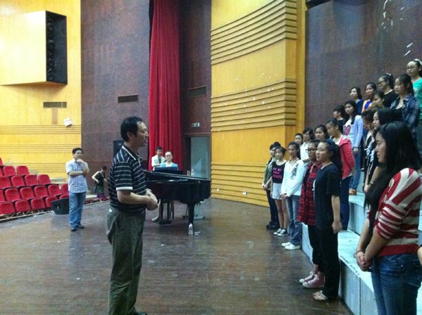 参加艺展的师生也进入了紧张的最后排练阶段。我校党政领导心系艺展师生, 在南校音乐厅,大合唱正在紧张的排练中,今天也特别邀请到了温州市合唱协会会长邹跃飞专家前来指导。同学们深情并茂的演出得到了领导和专家的一致好评。牟书记充分肯定了大学生艺术展演指导老师的无私奉献、辛苦付出,并鼓励同学们要克服困难、艰苦训练,相信大家一定能在浙江省大学生艺术展演中取得骄人成绩,为进军全国大学生艺术展演做好准备,同时叮嘱同学们平时要劳逸结合,注意天气变化,好好珍惜身体健康。 下午16:00,在北校音乐厅,表演唱也开始了紧张的排练,由于今天同学们第一次拿着话筒练习,声音的和谐和动作的配合还不是很协调,但是牟德刚书记亲切鼓励,使在场的师生深受鼓舞。大家纷纷表示一定刻苦练习,争取在大学生艺术展演的比赛中取得优异成绩,为校争光!