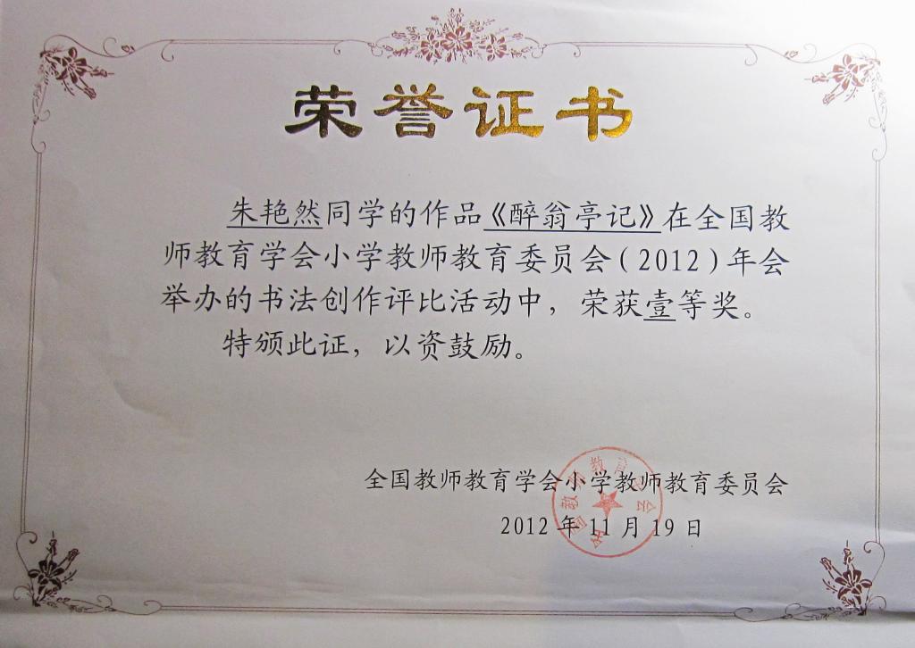 小教系选送的朱艳然同学的书法作品荣获一等奖。