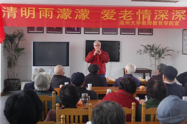 在军分区干休所里,志愿者们为所有老干部们献上了清明果和水果。随即,在军分区干休所的领导向大家致辞后,志愿者们为干休所老同志们及工作人员带去了精彩的表演,有《南泥湾》、《长江之歌》、《军营里飞来一只百灵鸟》等歌曲,还有即兴书法等。期间,干休所的老同志们及工作人员们看志愿者的表演看得兴致高涨,其中一位何叔叔给大家朗诵了他的诗作,还有位杨爷爷多次上台表演,不仅带来了葫芦丝演奏,还用长笛为志愿者带来的歌曲《映山红》伴奏,干休所工作人员的一句“老少搭配,唱歌不累”更使得全场大笑。最后,表演节目在由杨爷爷领唱,全场齐唱的《没有共产党就没有新中国》的歌声中落下帷幕。