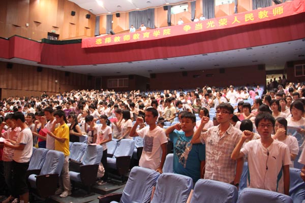 今年迎新工作的一个创新,壮观的的入学宣誓现场,也将开学典礼推向高潮。“我宣誓,严格遵守大学生行为准则:志存高远,坚定信念;热爱祖国……”在新生代表管叔萍的带领下,全体新生在晚会上宣读了了成人色情