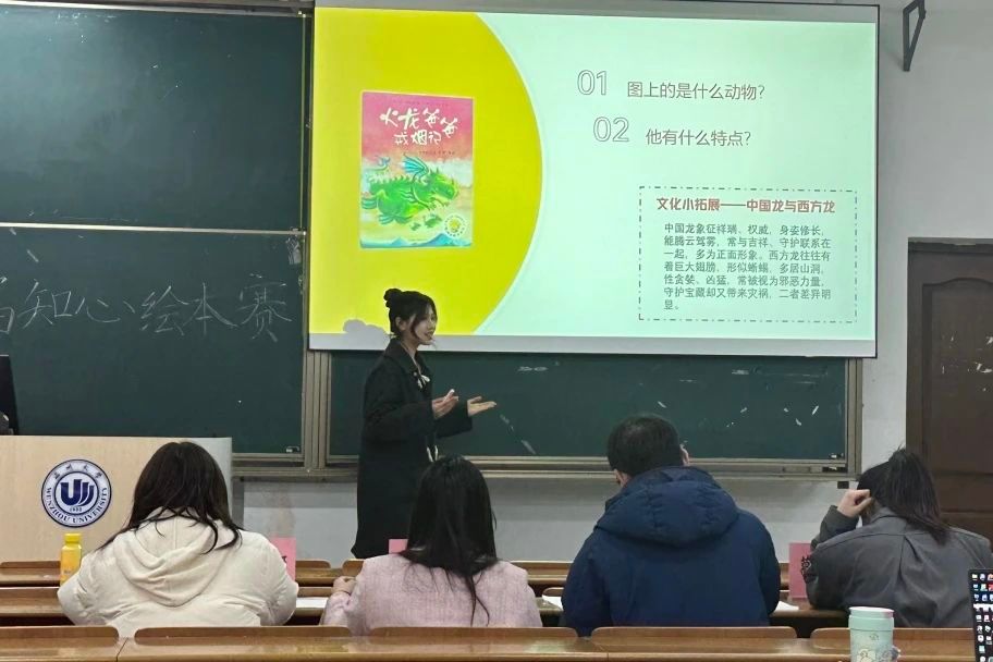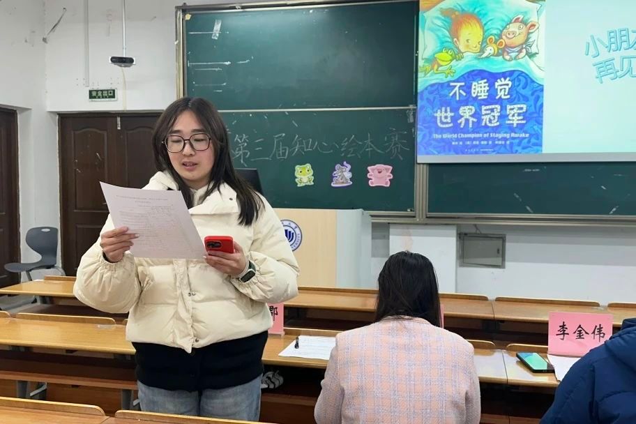 决赛特别邀请了曾悠扬老师、李金伟老师、曹容郡同学和葛泽茹同学出席评委,十八位选手有序分组进行了课前绘本讲课ppt的制作与五分钟的限时课堂讲演,在这有限的五分钟时间内,选手们竞相绽放出了独属于他们的师范风采与教学艺术。创意无限、引人入胜且充满欢声笑语的课堂安排,无一不彰显出独属于师范生的魅力与温馨氛围。在这两次的比赛中,我们见证了选手们高超的的课堂技巧。