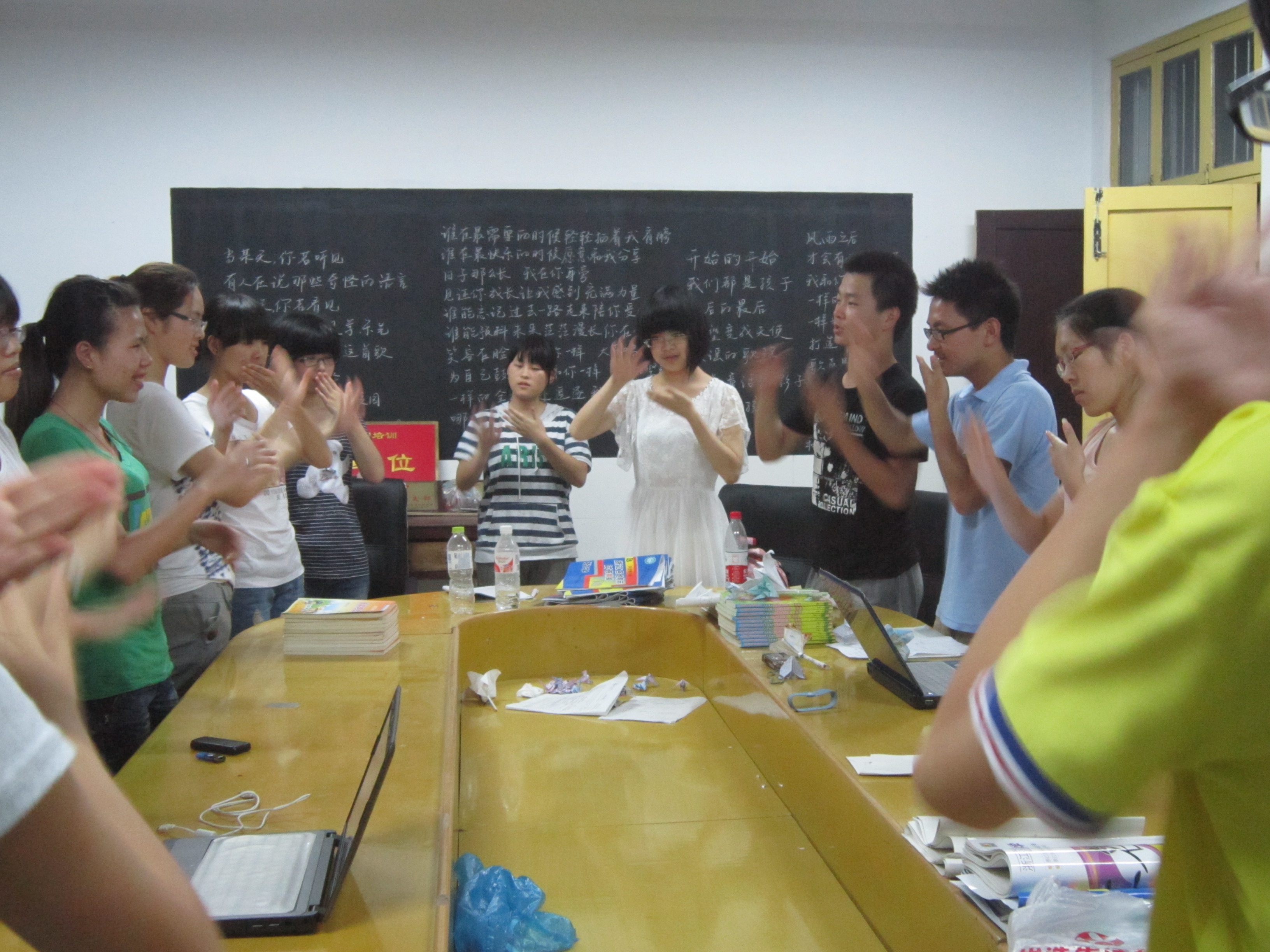 时间犹如白驹过隙,眨眼间已经过去了一半,实践队短暂的支教生活即将接近尾声,这也意味着成果汇报演出的脚步越来越近。为了更好地迎接最后的成果汇演,队员们在休息之余,利用一切可把握的时间,紧锣密鼓的准备着。晚上,当所有的坐班小老师结束夜自修的任务后,匆匆忙忙地赶到会议室,与等待已久的其他队员汇合,之后就是学习手语了。教习手语的老师是实践队的成员之一,在开始之初,“手语老师”为了满足队员们这些超龄儿童的好奇心,就先给他们露了一手,想当然,博得了阵阵掌声。接着就是正式学习了。由于有些队员之前未曾接触手语,毫无基础可言,所以“手语老师”根据实际情况拆分动作进行训练。别看一句话就那么几个动作,可是连接起来,大家就变得手忙脚乱,两只手更像有了自己的意识一样不听使唤。半首歌的教程结束了,然而队员们学了后面的动作早忘记前面的,于是只能周而复始的练习。好在这里大多数人不愧是小教专业的,领悟能力特别的强,在老师极有耐心的教导下,学过几遍之后终于渐渐地有了那么点感觉。