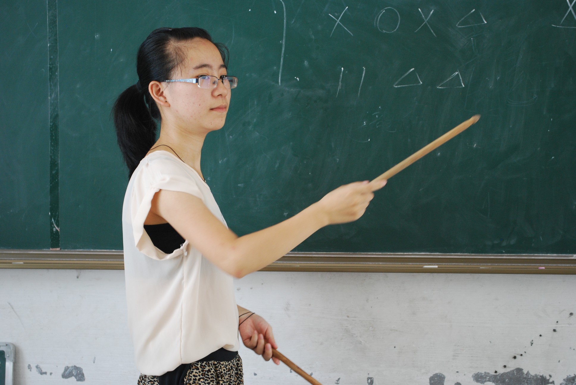 瞿老师先让学生分坐成两排,然后在黑板上整齐的写下了四个不同的节奏,接着让队员们自行练习。10分钟后瞿老师开始对每个学生进行一对一的指导。刚从意大利回来的家良小朋友特别紧张,他用小手牢牢地握住鼓槌,眼睛紧紧地盯着老师所指的节奏,可是越紧张越是容易出错,在第二次出错的时候,他涨红着小脸对老师说:“我还不熟练。”瞿老师温柔地注视着他,微笑地对他说:“没关系,我们慢慢来。”慢慢地,在老师的鼓励下,他的脸上渐渐出现了满意的笑容。在一对一的辅导过后,每个人都能较为熟练地敲出这四个节奏。瞿老师趁热打铁,立即组织大家集体练习。“咚咚咚咚咚咚”大家敲开了,可是由于每个同学的速度不一样,小小的教室仿佛炸开了锅。瞿老师急忙让大家停下来,不厌其烦地给大家示范了好几次,然后让大家进行分小组练习,渐渐地,大家似乎找到了感觉,几遍下来,竟然都没有出错。正如中国一句古话:世上无难事,只怕有心人。