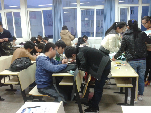 傍晚六点整,同学们准时来到教室,每位同学都领到一张圆形纸片,用来写祝福语。不一会儿,现场的气氛就热闹起来了,大家随即展开热烈的讨论,各抒己见。有的同学一气呵成,短短几分钟便写了长长一段话,却仍然感到意犹未尽,也有的同学只写了短短几句话,言简意赅,却也是寄托了满满当当的对于新成人色情