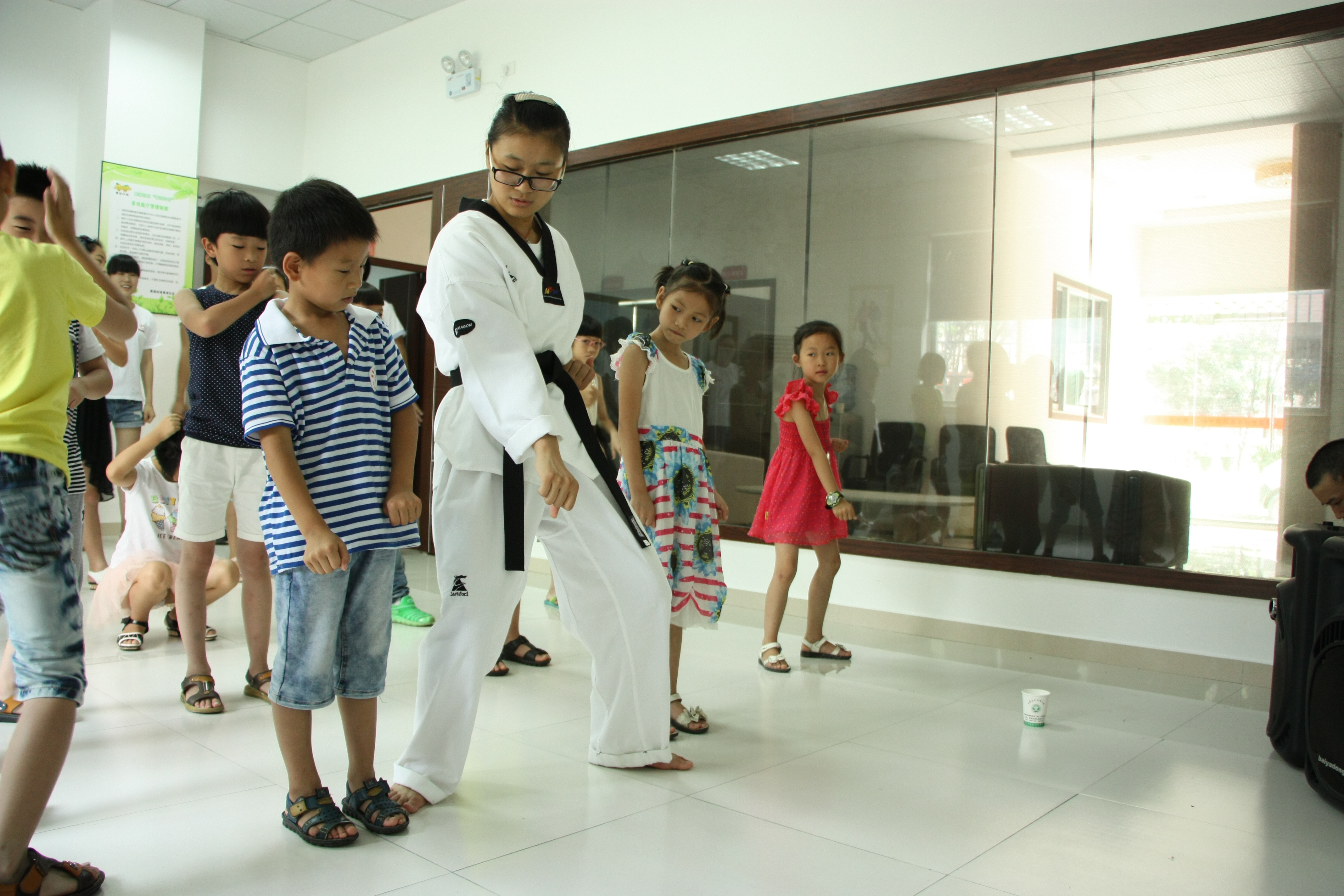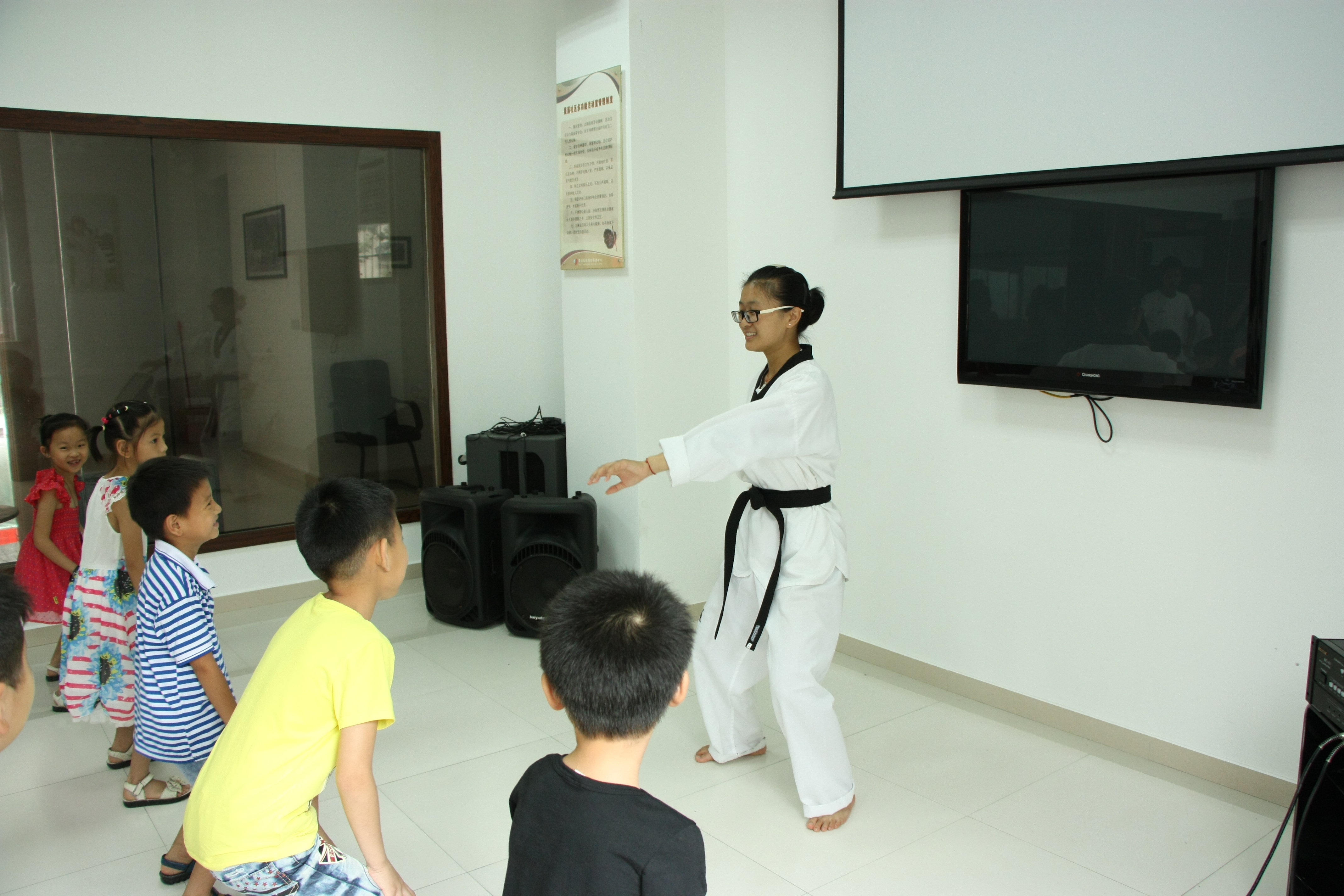 课程在九点准时开始,在会议室中,梦之队实践队的队长,在昨天晚上充足的准备下,给小朋友举行了别有洞天的安全教育课程,队长以幽默的方式介绍了自己,同时她也给安全课带去她的幽默,在快乐中小朋友们学习了安全知识,同时也为了让小朋友有更健康的身体,特地给小朋友们准备了跆拳道基本知识和动作要领,虽然小朋友学得有点慢,但在队员们的教导下,小朋友们也慢慢的学会了,还有一场自我介绍,让小朋友一个个自我介绍,并发上奖品。课程也接近尾声,队员们跟小朋友开始了一场乒乓球赛,欢声笑语在活动场地上荡漾!