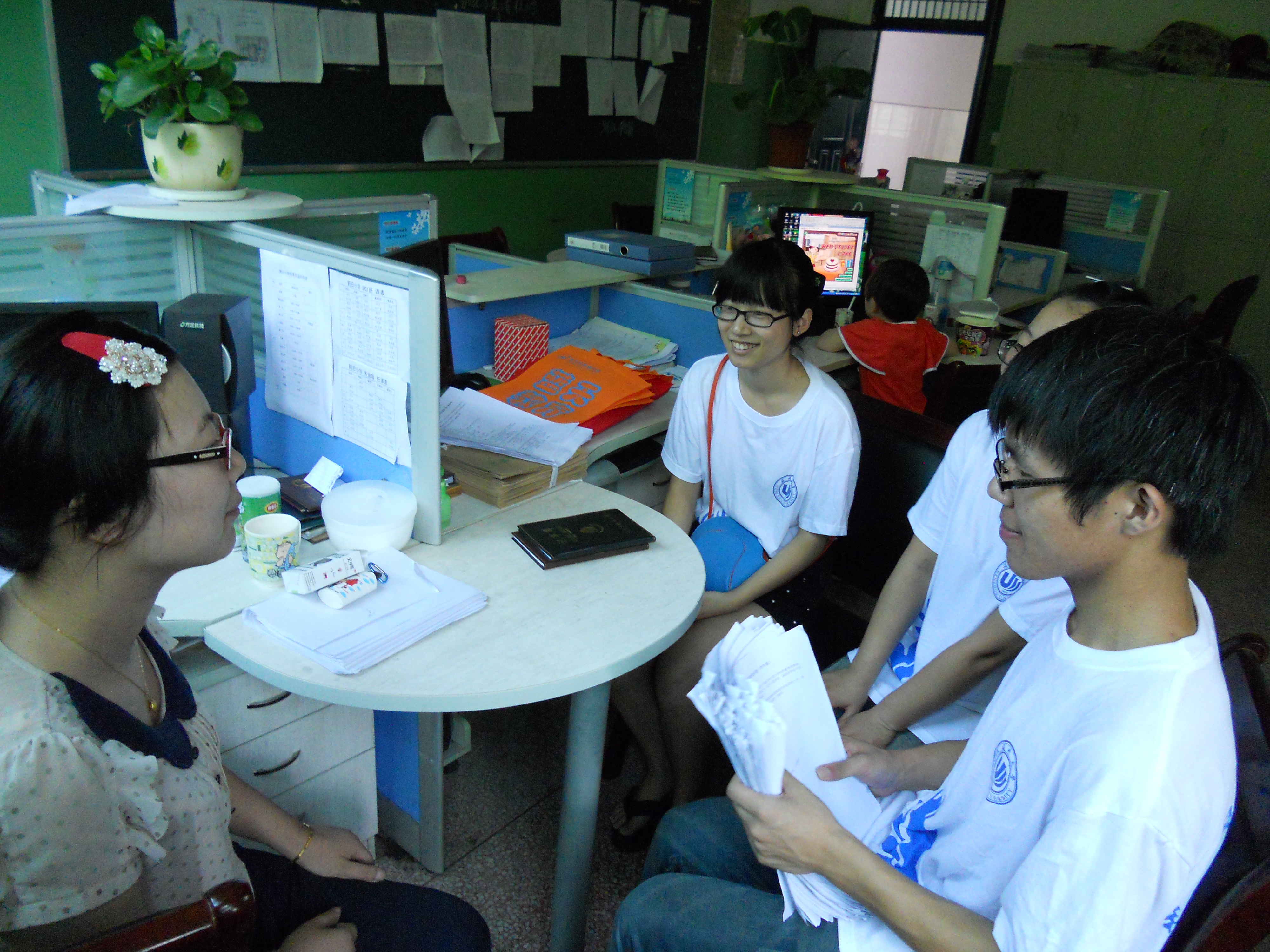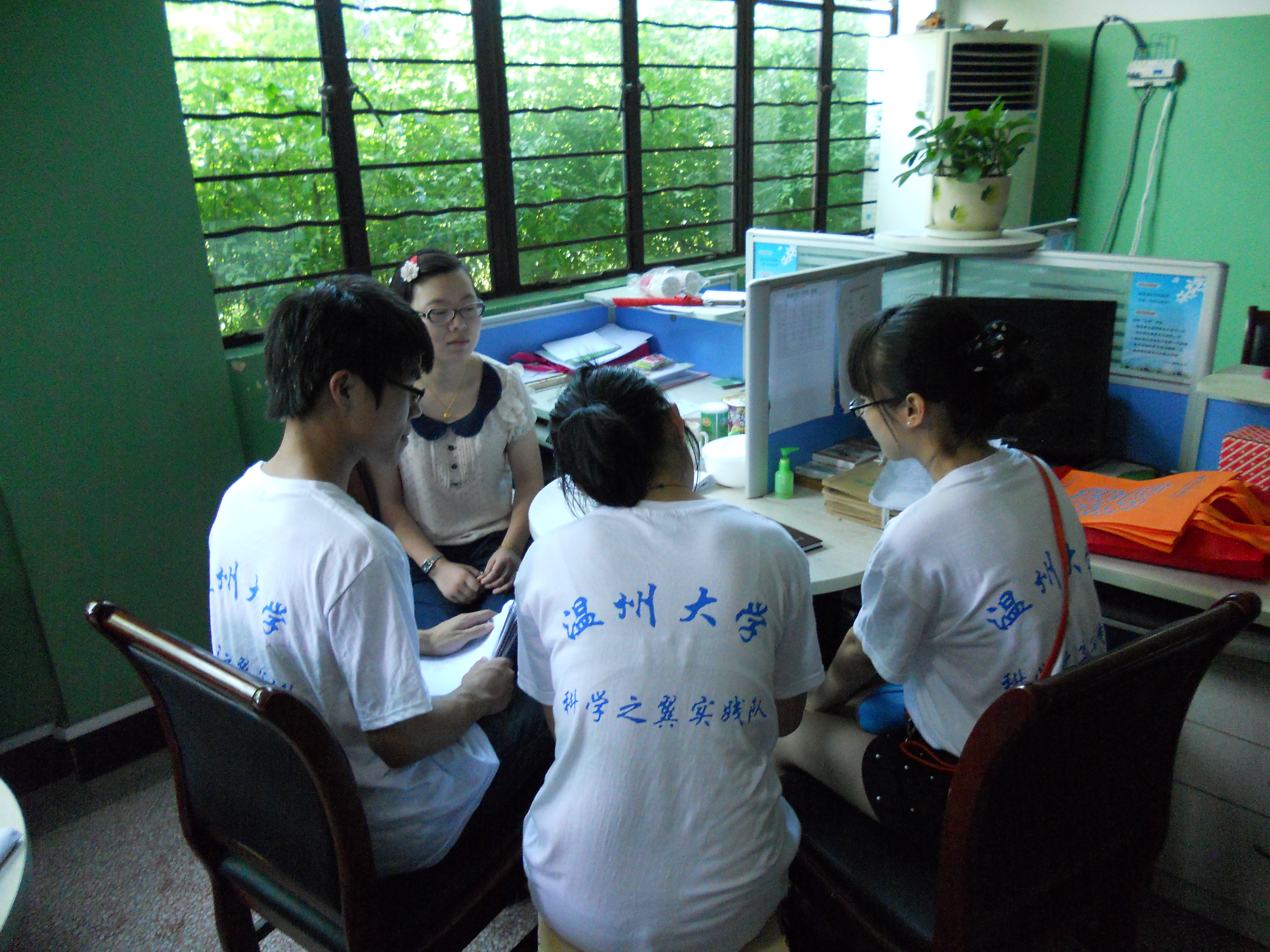 科学之翼温州市茶山镇实践队小分队。在统一集合后一起去茶山小学进行今天的教师访谈。今天我们所要访谈的对象是一位兼职的科学老师陈老师,但是从谈话中可知陈老师还是一位经验比较丰富的老师,目前也担任两个班的科学老师和一个班的数学老师。