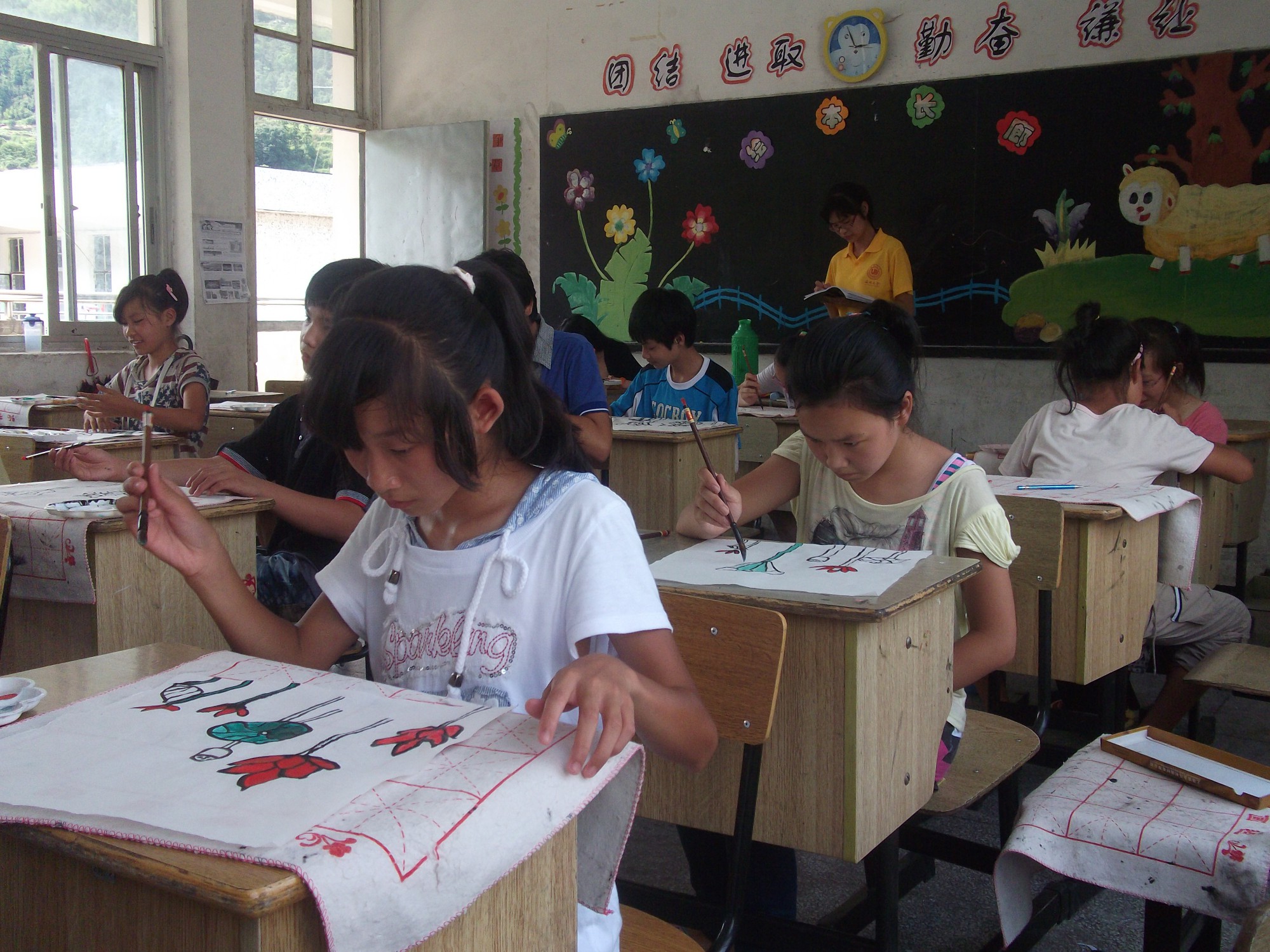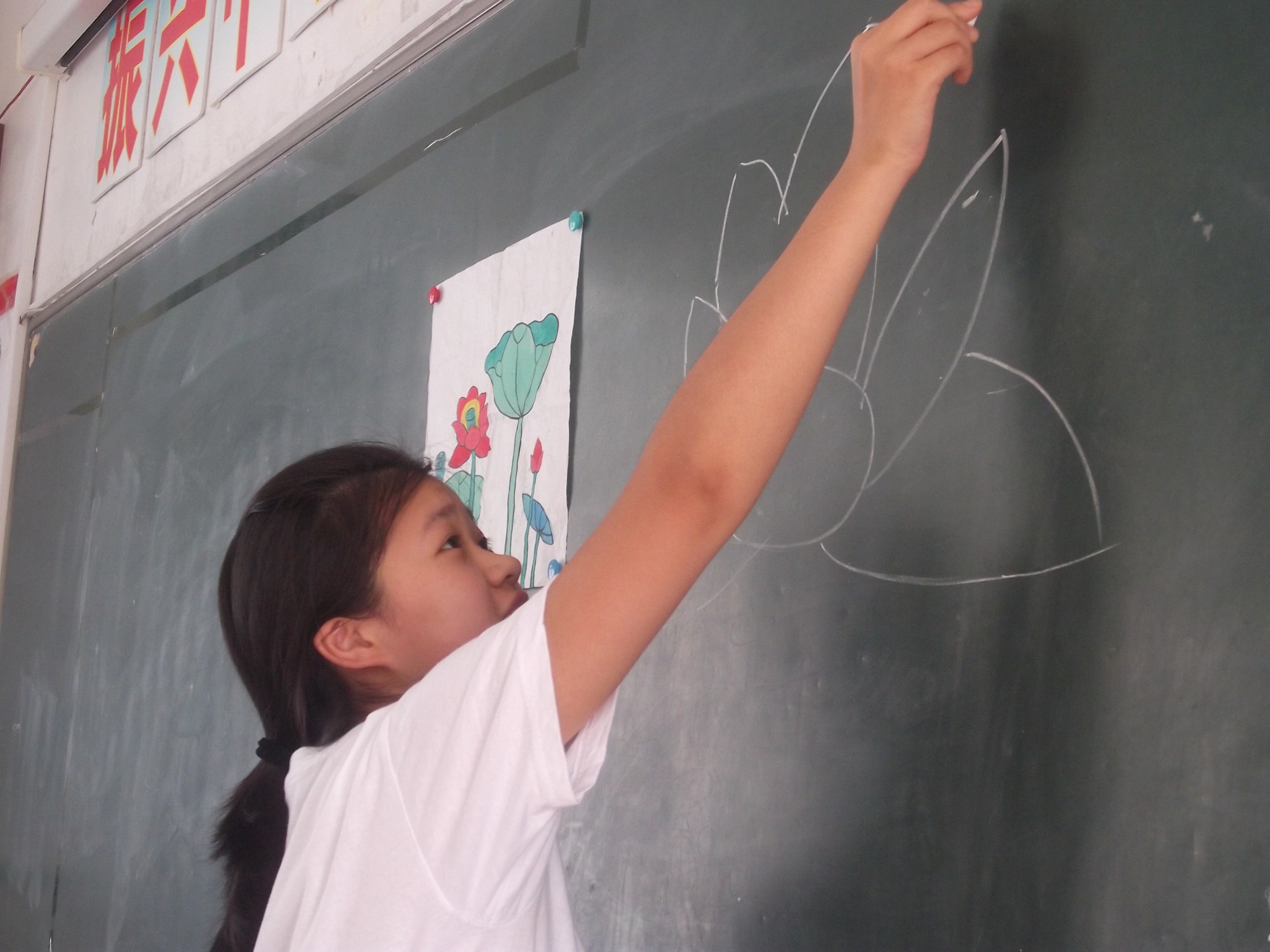 下午2:30,快乐一班上的是绘画课——《夏日清荷》。老师先将画好的作品贴在黑板上,学生们被美丽逼真的荷花吸引了。紧接着,老师对整幅图的结构和组成做了详细的讲解,并在黑板上一笔一笔画出来。学生们专注地看着老师,生怕自己错过任何一笔。在老师的指导和鼓励下,学生们拿起了铅笔先画线,一朵朵荷花,一株株荷叶从他们的笔尖下诞生。然后学生用毛笔勾线,他们勾得很仔细,每一位同学都想要绘出心中最美的图画,老师感到很开心。最后是用毛笔上色,学生在上色的时候将他们观察到的颜色的深浅都表现出来了。于是,一幅幅夏日清荷图就出炉了,学生用画笔绘出了自己心中的美,一个个都兴奋地举起自己的作品给老师看,脸上的笑容洋溢着自豪感和成就感。出乎意料的是,许多已经完成作品的学生又继续拿起笔开始画金鱼或者菊花,复习上节课所学的知识。他们对绘画的热爱和对美的追求让老师们都感动不已。