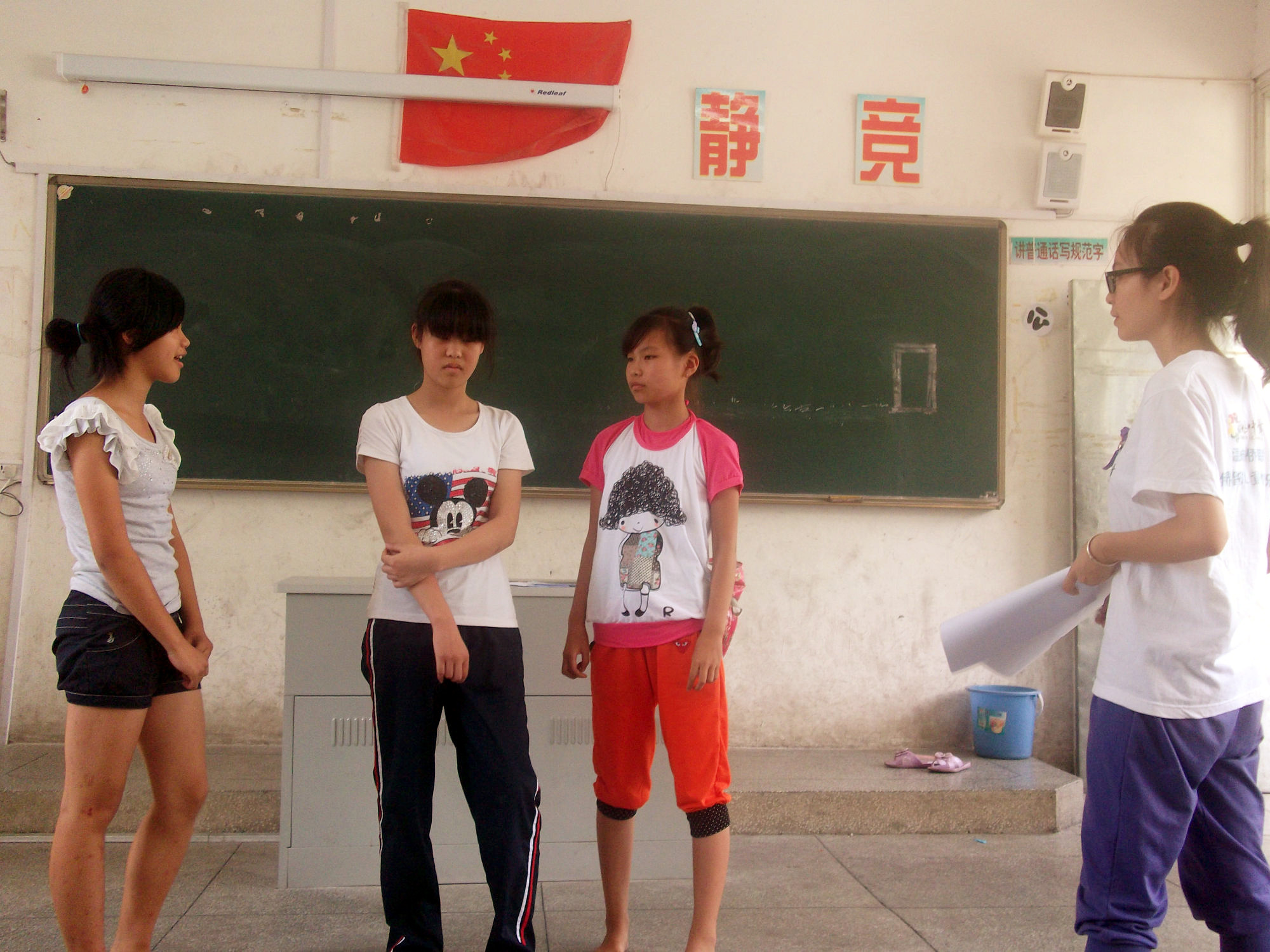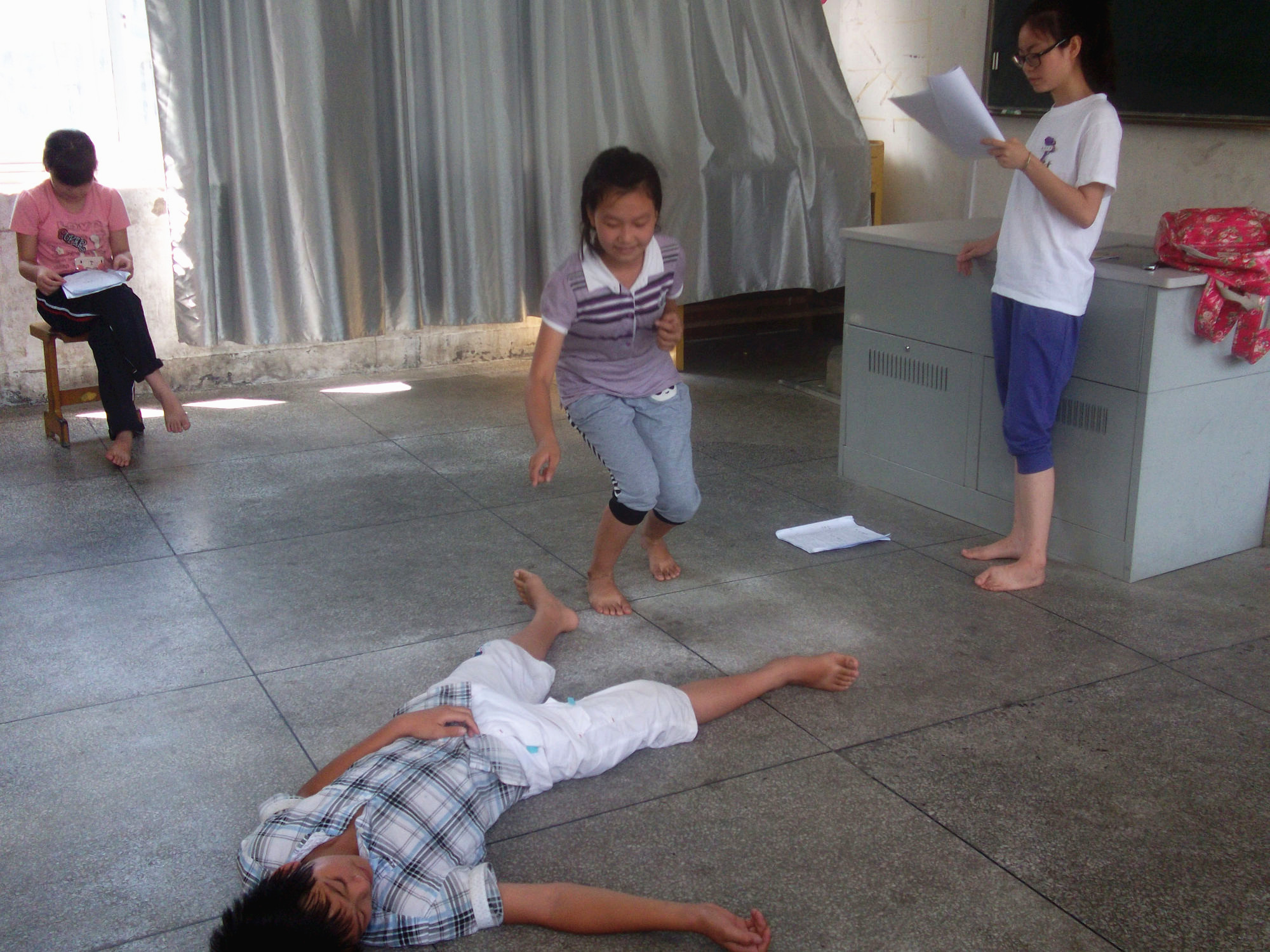 在两天前,学生已经拿到了剧本,并且角色也已分配完毕。该剧为多幕剧,共五幕,根据剧本的幕数,老师分出了其中独立的两幕,让学生先自我排演,剩下的三幕,人物有交叉,学生们就根据时间顺序,在老师的带领下一幕幕排演。大约十分钟之后,学生们围成一个大圈,让已经准备好的同学先排练,然后与老师交流,一起出谋划策,改进小演员们的演技。当然,这是第一次排演,有很多的小问题,比如对剧本的台词不够熟悉,不能脱稿;比如表情、语气不够生动;另外,很多时候,学生们忍不住笑场,拖延了排演的进度。但是,热情的他们,即使在下课铃响后,还是主动要求延课以至完整地排好整部小品。