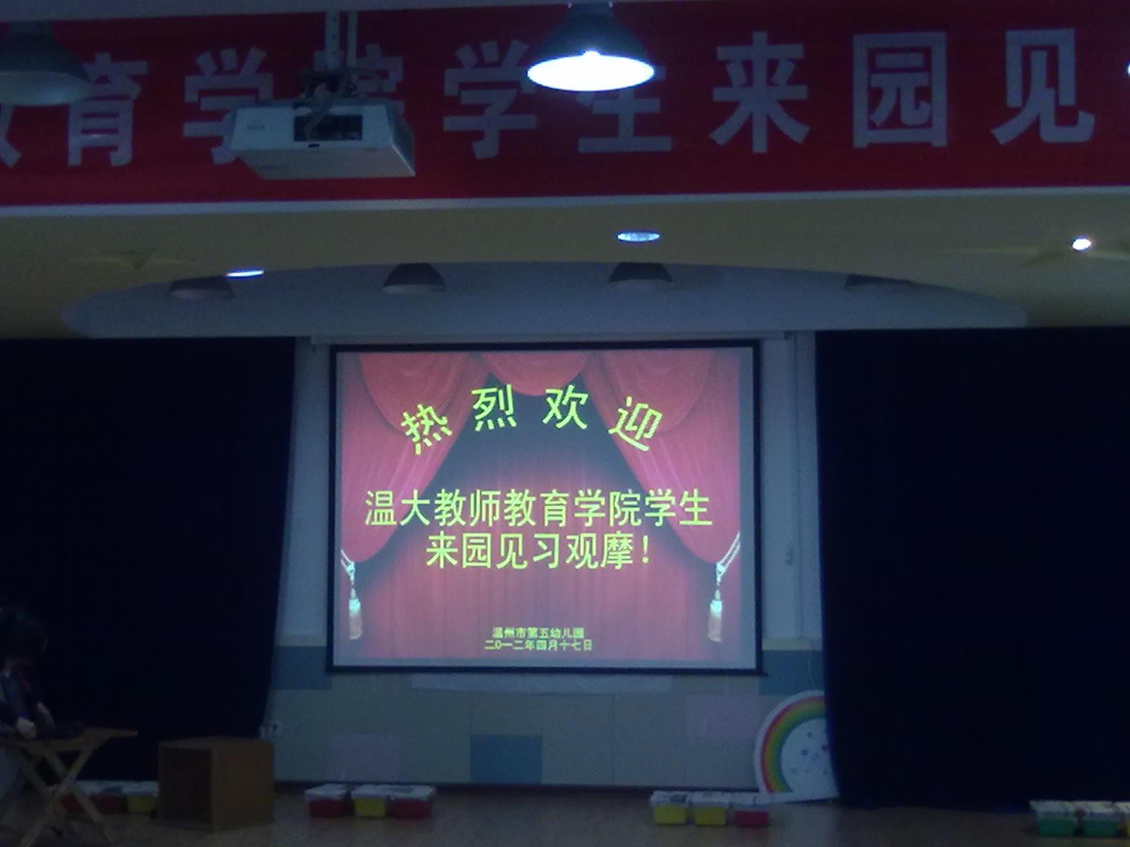 教师教育学前教育来我园听课”。这让我们感到受宠若惊。到了五幼宽敞的会议室后,又看到了高高挂起了热烈欢迎我们的横幅。我们十分感谢五幼的热情。