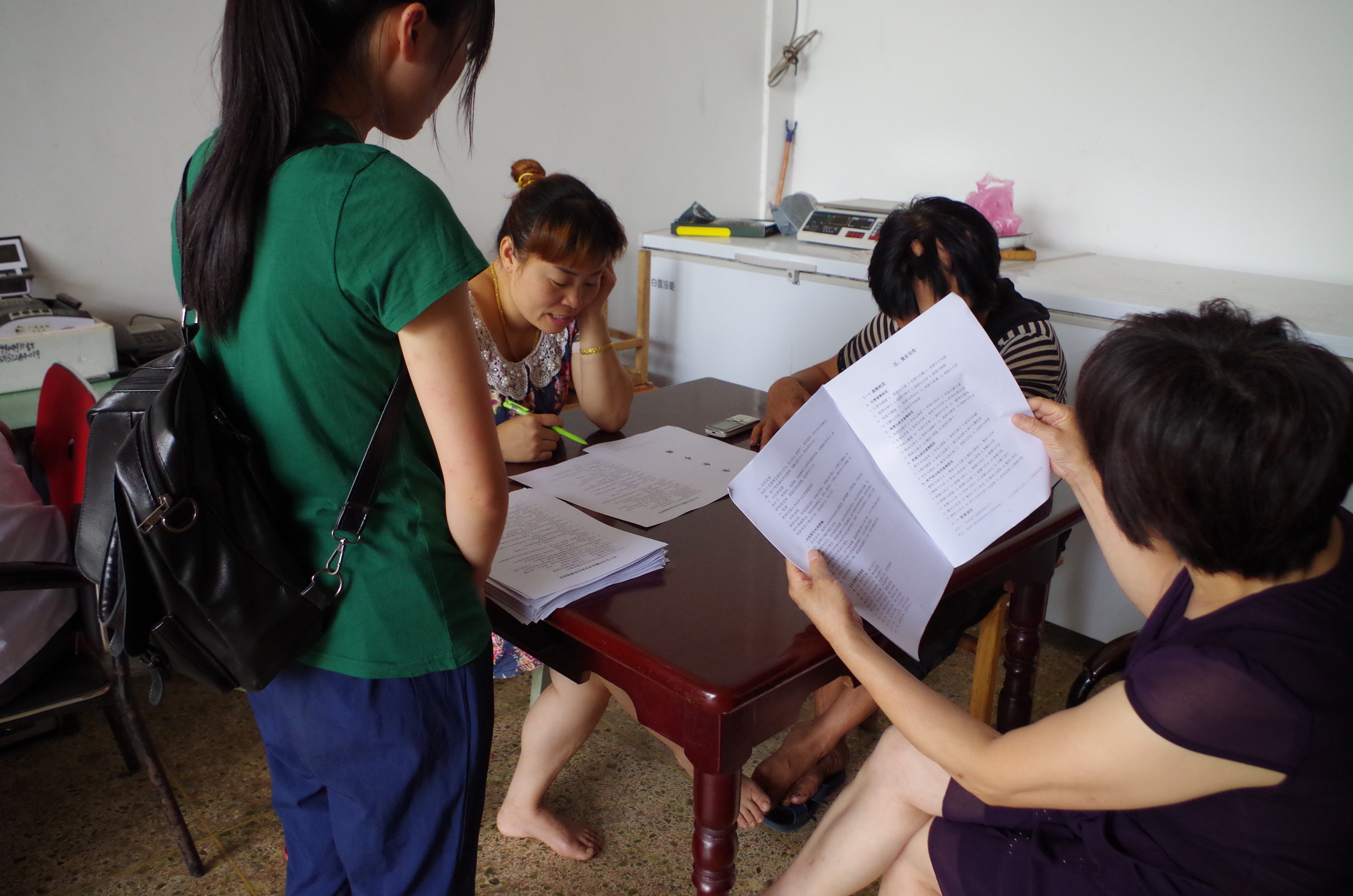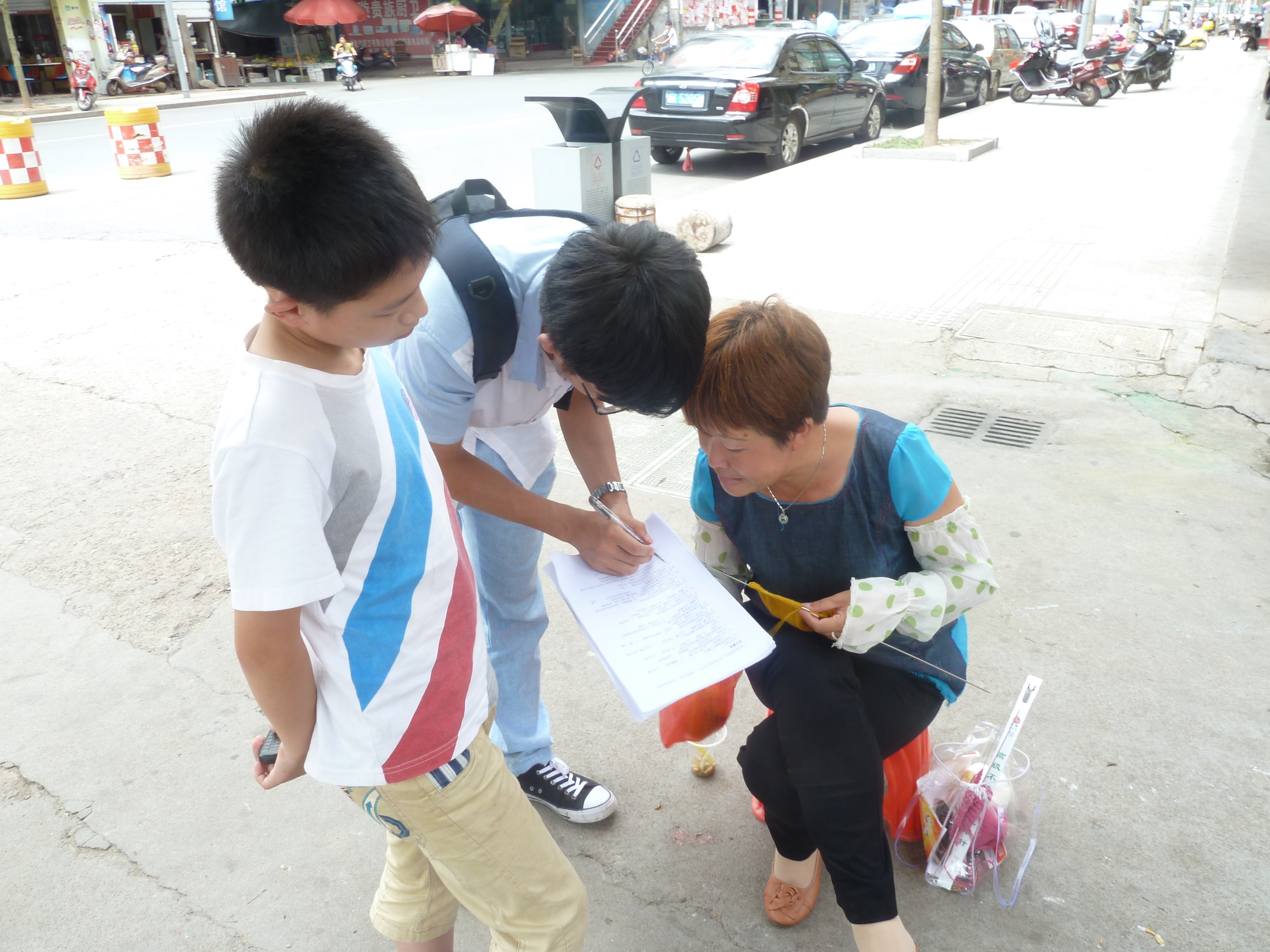 一组成员以新华书店为主要“根据地”,积极地询问每一个来往的顾客;一组从巷头调查至巷尾,只要商店的店主有空,就趁机分发问卷,进行调查。第三组同学则选择了人口密度较高的候车室。因为松阳县的人口众多,也方便了同学问卷的发放,成员们真诚的微笑和诚恳的态度也使得人们愿意抽出一些空余时间来填写问卷。尽管在此期间遭到不少过路人的拒绝,也被人们怀疑不单纯是发问卷的,但在同学们的解释和发放安全手册后,人们渐渐地配合起成员们的工作。