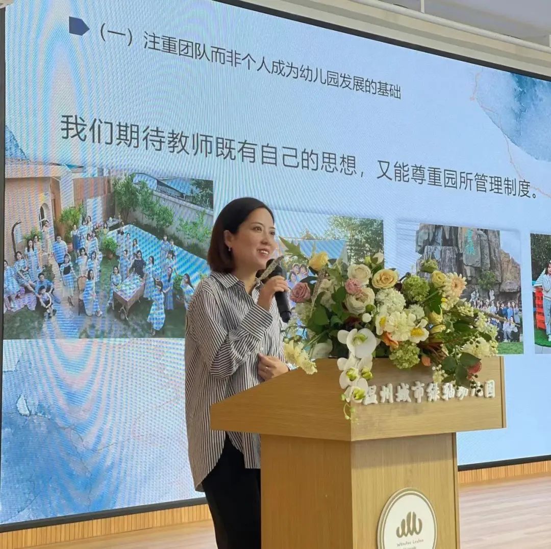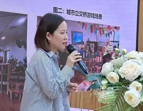 随后,贾令厨园长进行了《从物质空间到关系空间的构建》观点报告,让我们思考如何从儿童视角出发进行幼儿园的空间打造。而陈琼瑶老师为我们介绍了幼儿园的融乐园课程,从萌芽到发展,再到老师们感受到了融乐园课程的具体落地。