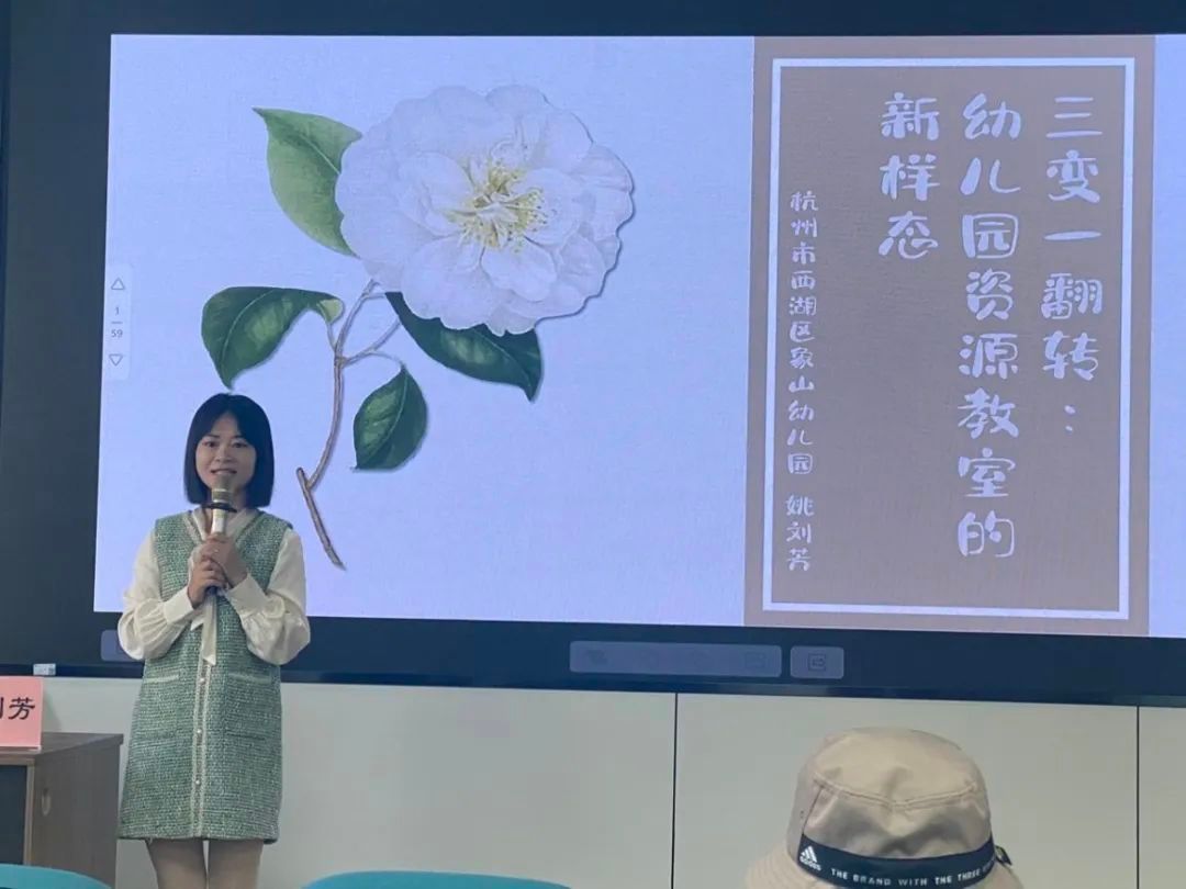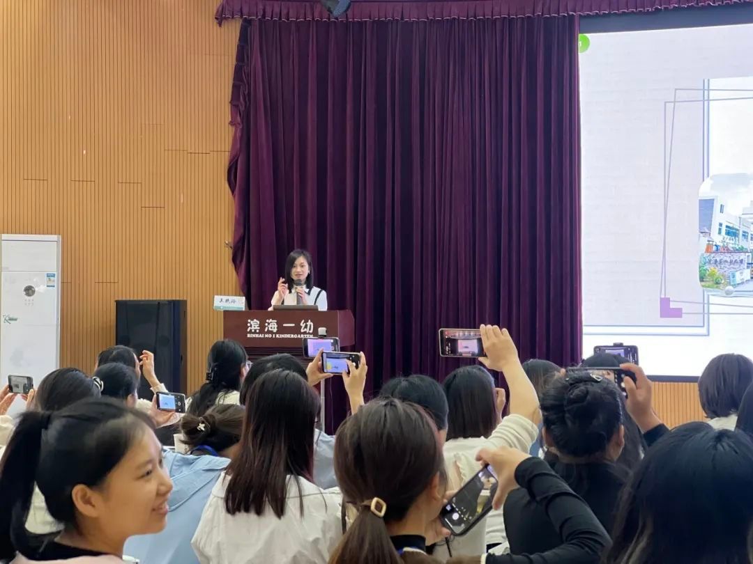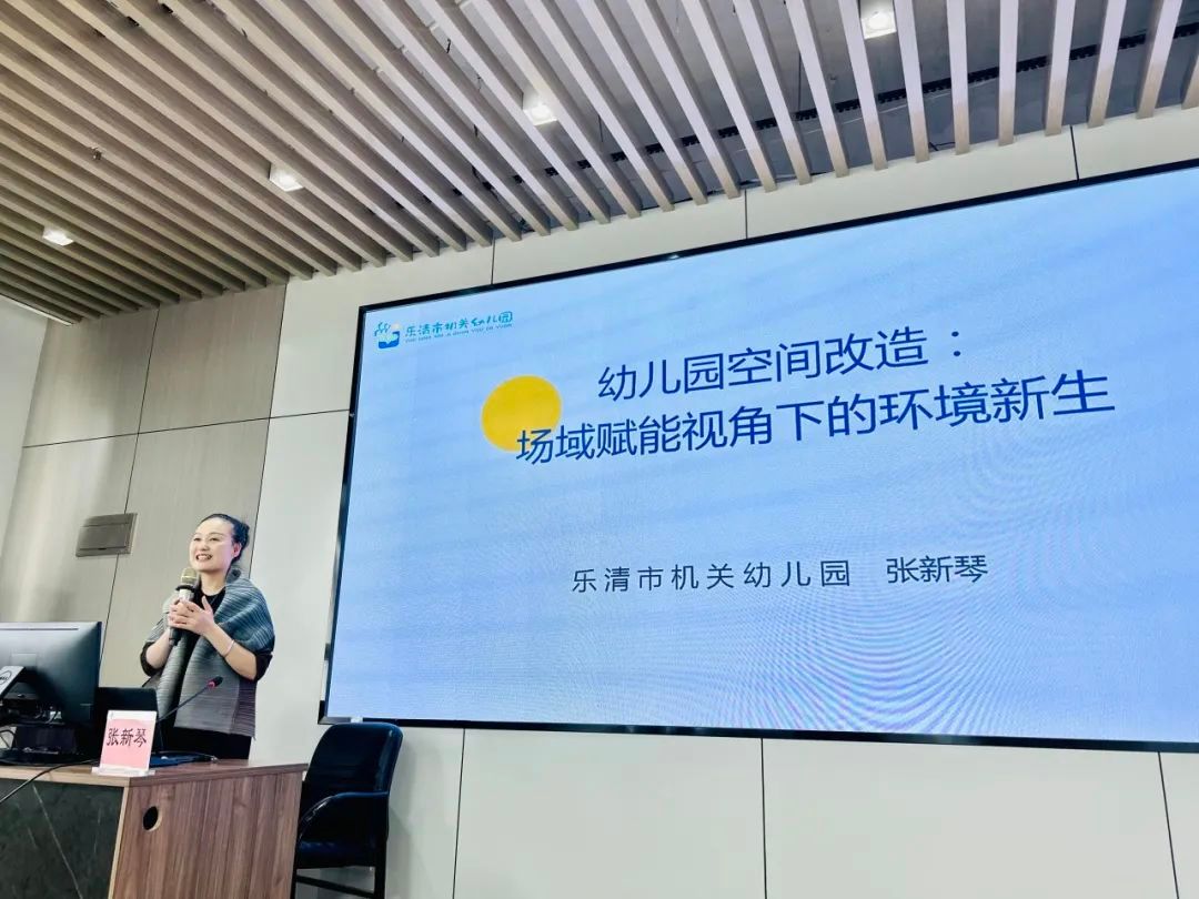 乐清市教育研究培训院教研员、乐清市机关幼儿园张新琴园长就“如何站在幼儿立场,如何结合办园指导思想,如何基于园所实际特点等打造智慧环境”进行专题讲座。张园长以机关幼儿园三所园区为例,结合各园区的环境特点,分别从大环境的创设、园所空间的改造、儿童表征与主题海报的呈现等方面进行分享,让在场的学员感受到了环境创设的重要性。