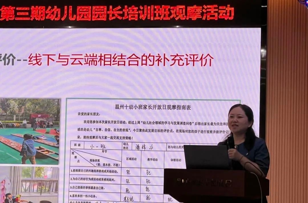 19日上午,学员们走进温州市第十幼儿园进行观摩。陈晓为园长通过游戏的三位一体评价,教师通过科学循证、分析评价、回应支持,幼儿通过与他人观点碰撞形成积极的社会性品质,家长通过补缺和验证,让游戏发展公正客观,从而让社会性游戏培养五会小公民。