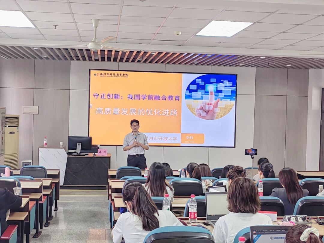温州市特殊教育指导中心李科副主任以残疾观、医疗科技的发展、国家政策和社会的发展,分析了特殊人群发生率及原因。同时李主任也结合各类数据分析了当前特殊教育的现状,再牵引到学前融合教育,主要以学前融合教育的内涵、安置模式、学前特殊幼儿评估内容、多元融合实例等多方面进行了详细讲述。从解读学前融合教育的困难到直面与聚焦教育困惑,带领着学员从人文氛围的建设、评估安置和工作要点的科学规范、专业的多维课程与教学支持评价、以及教师特殊教育能力的提升等不同的实例与策略为学员充实了学前融合教育理念,也为各位学员在以后的学前融合教育工作道路上提供了借鉴。