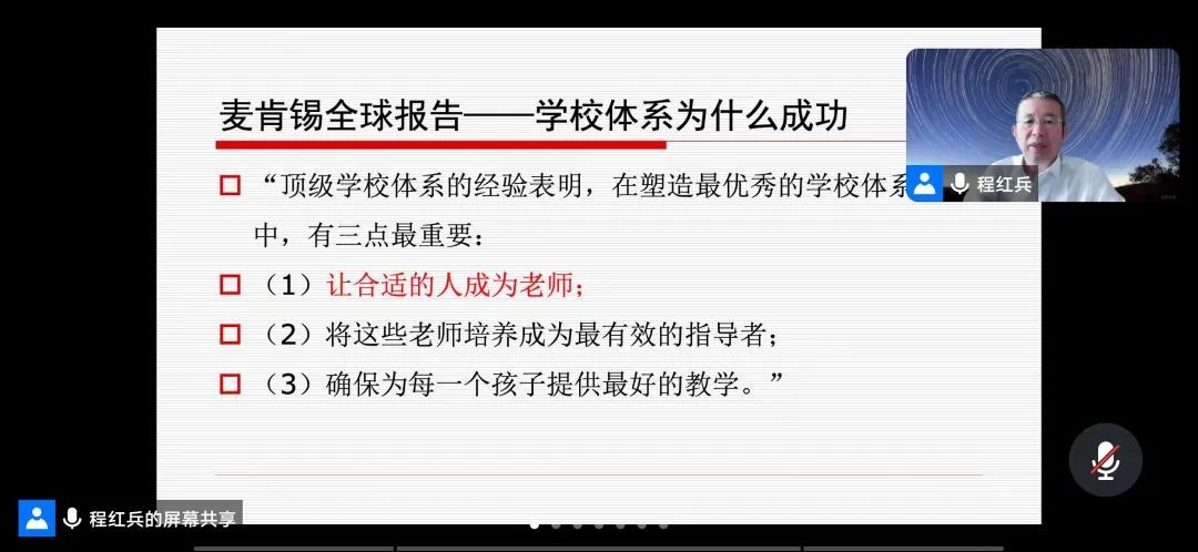 金茂教育集团总校长兼教育研究院院长程红兵教授带来《让教师在行动中发展》讲座,他首先提出“解放教师,让教师作为主体充满活力”,教师作为学校的主体发挥主人翁的作用尤为重要,当前教师被许多不是教育教学的杂事所困扰;然后指出“促进教师发展,让教师在行动中成就智慧”,教师的成长需要一个渐进式和智慧的积累过程,不是一蹴而就的成长。程校长在这两个方面详实地分析当前教师的状态及学校管理者应该从哪些方面发挥他们的长处与积极性。